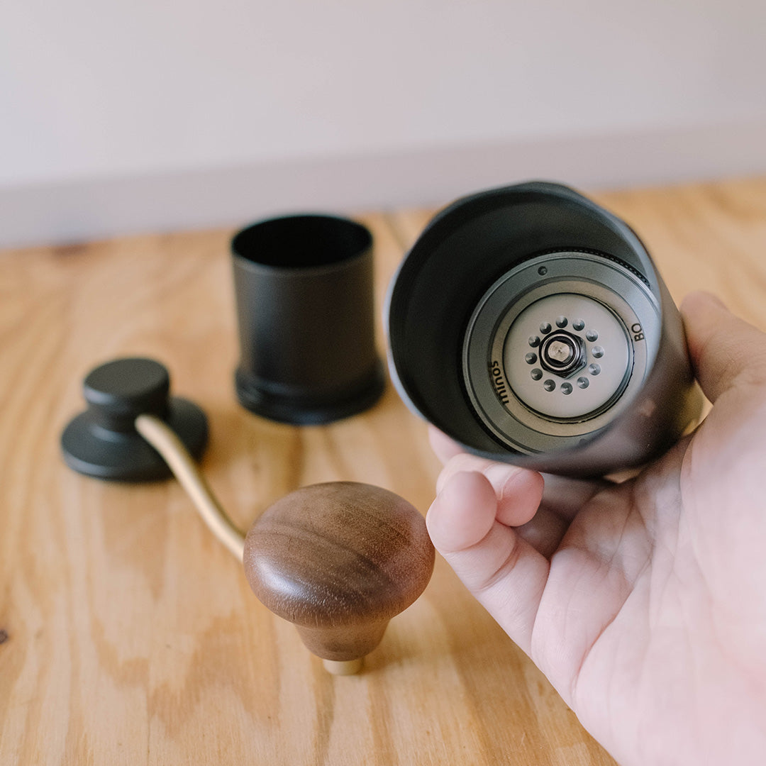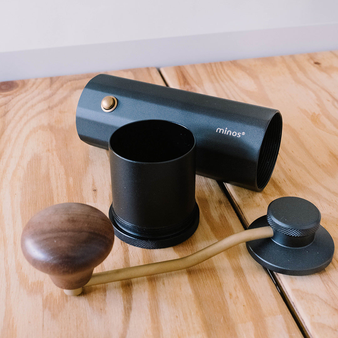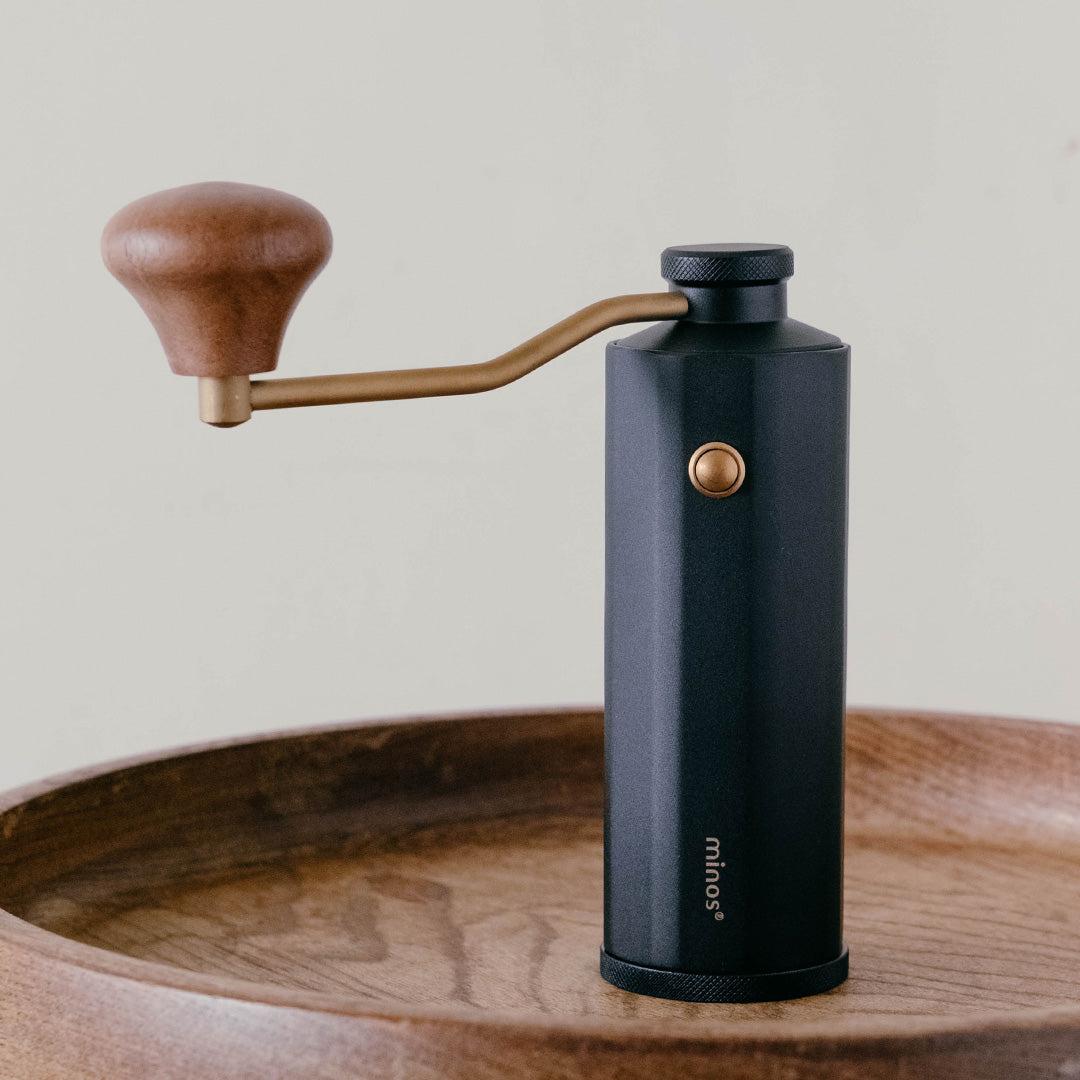 來自香港設計團隊Minos所設計的手搖磨豆機,在咖啡界有著中階手搖磨豆機CP值之王頭銜,研磨品質佳,堪比萬元小富士平刀電動磨豆機,採用雙軸承設計,研磨細度可到義式濃縮等級。做工扎實,內採食品級合金鋼與鋁合金支架,非低階的強化塑膠製作,耐用度更佳。特有的外部調節按鈕,可再不開粉杯使用下,更改研磨粗細度。
