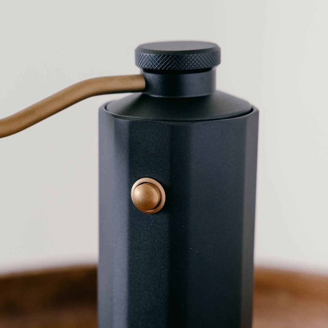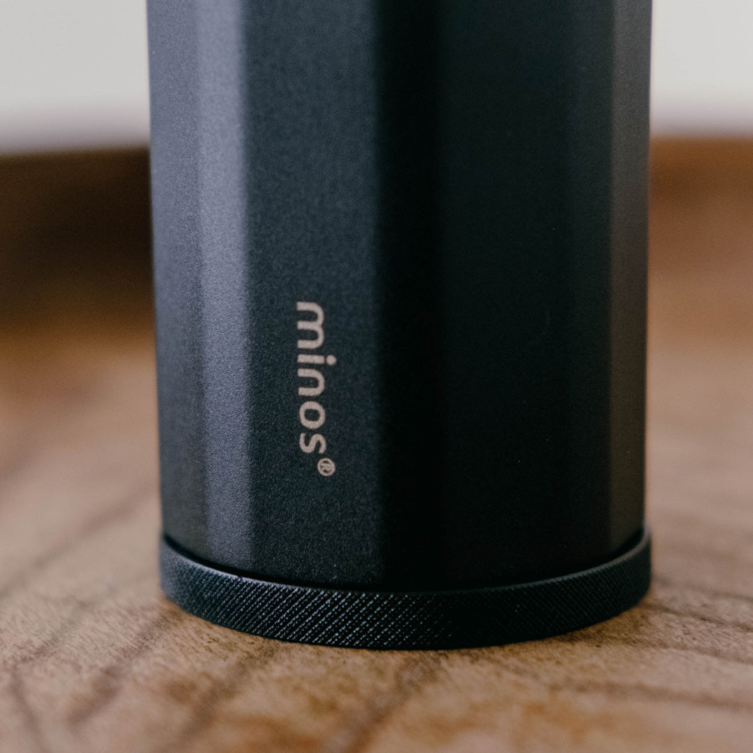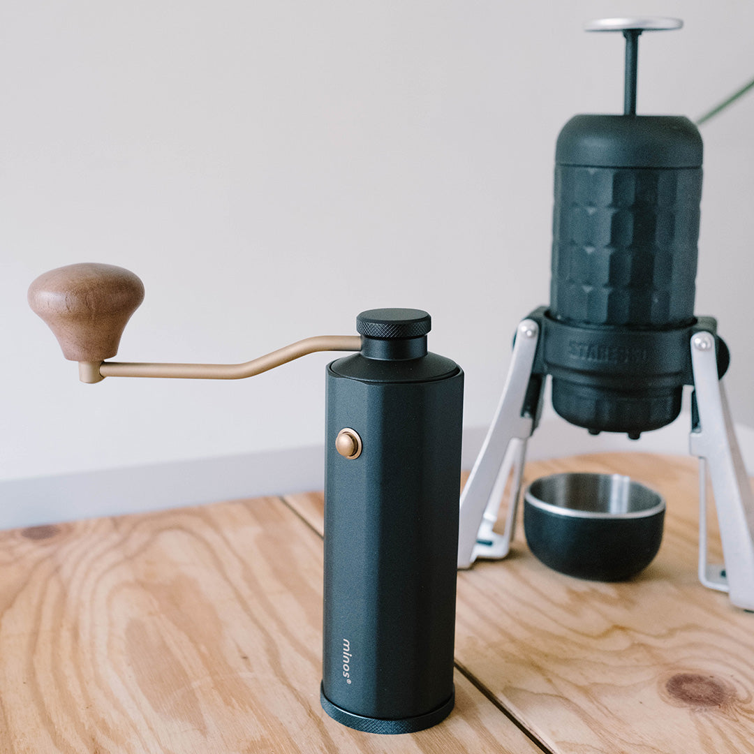 來自香港設計團隊Minos所設計的手搖磨豆機,在咖啡界有著中階手搖磨豆機CP值之王頭銜,研磨品質佳,堪比萬元小富士平刀電動磨豆機,採用雙軸承設計,研磨細度可到義式濃縮等級。做工扎實,內採食品級合金鋼與鋁合金支架,非低階的強化塑膠製作,耐用度更佳。特有的外部調節按鈕,可再不開粉杯使用下,更改研磨粗細度。