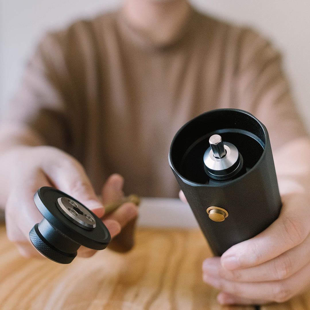 一般手搖磨豆機調整通常設計在粉杯內,若再研磨後想要調整粗細,這時候就必須先清潔粉杯後才能調整。但Minos創新的調節按鈕設計,不需要開粉杯,直接按著按鈕,依照使用方式即可調整,對於一下要製作手沖、一下要濃縮的我,真的超方便的。
