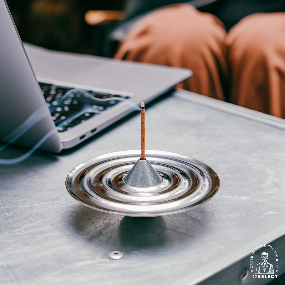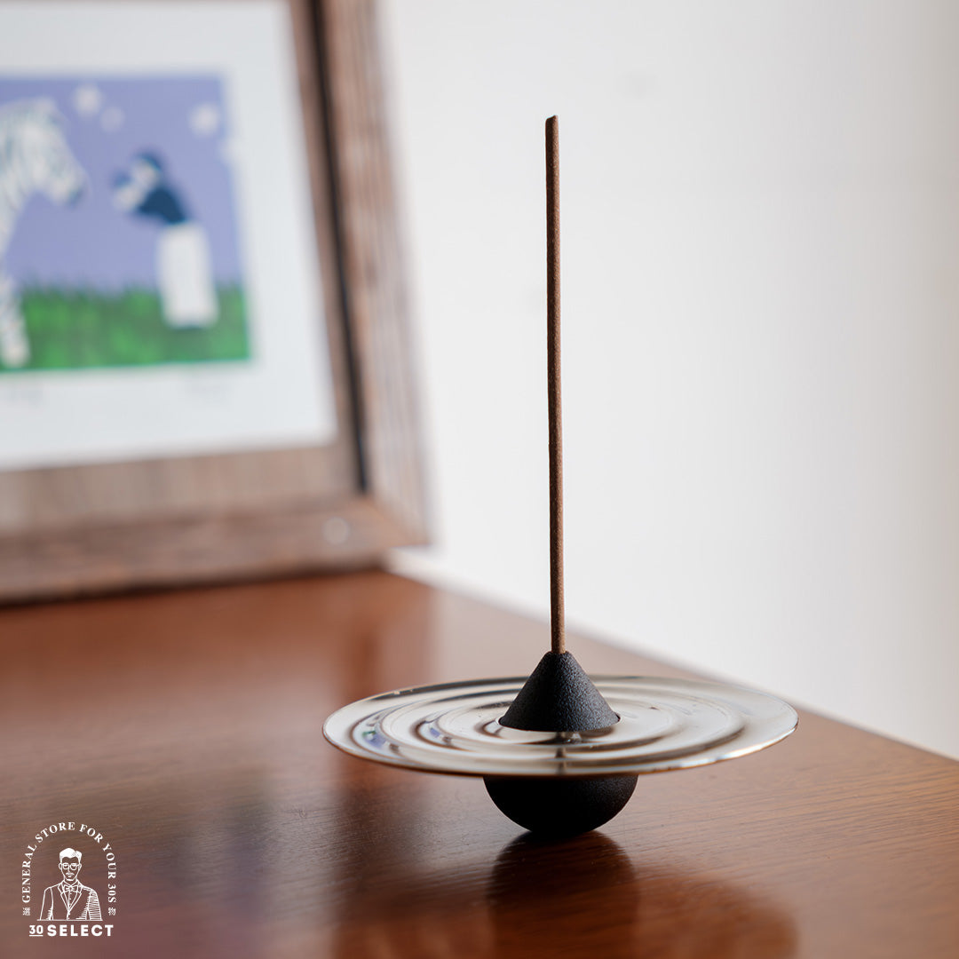 - 水滴造型線香座,搭配漣漪迴旋的不鏽鋼接灰盤
