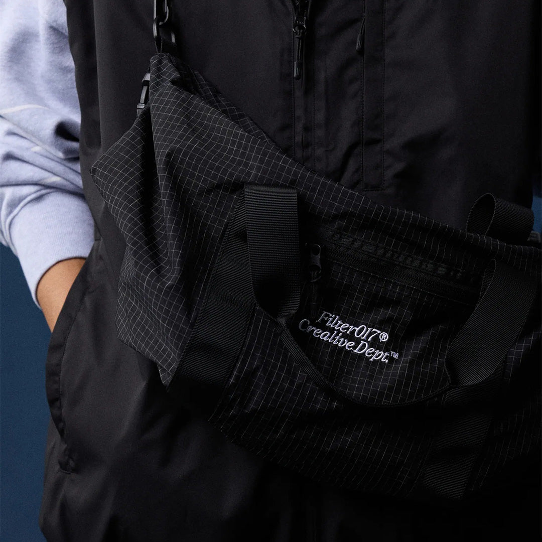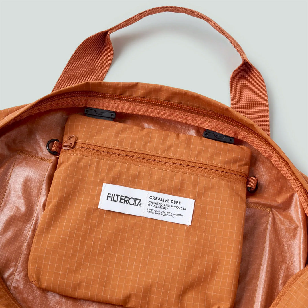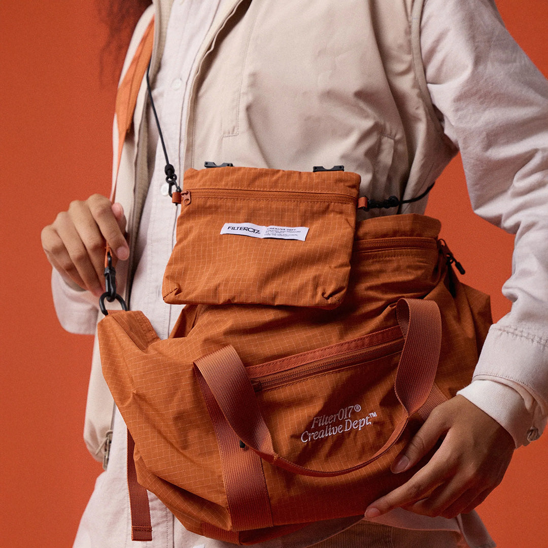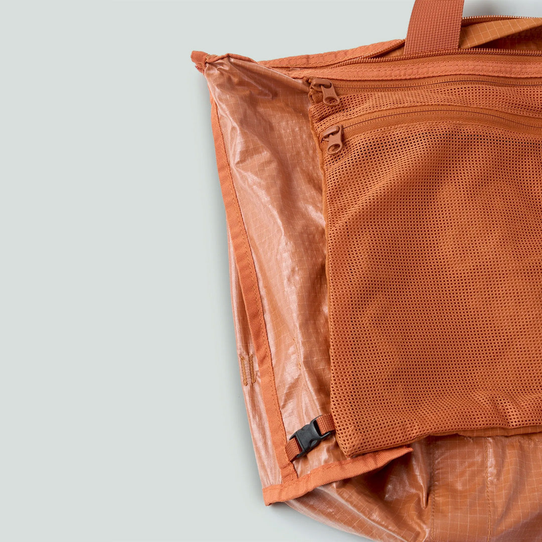 主體包身使用高密度防潑水尼龍,內層貼合防水膜,兩側插扣可依內容物多寡調整包型。隨身小包以滑扣設計快速拆卸,能當內袋,也能接上背繩單獨使用;網布收納袋平時固定在內裡,拿來放鑰匙、票卡或小物,很順手。