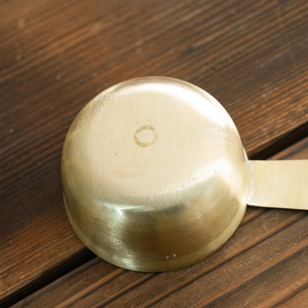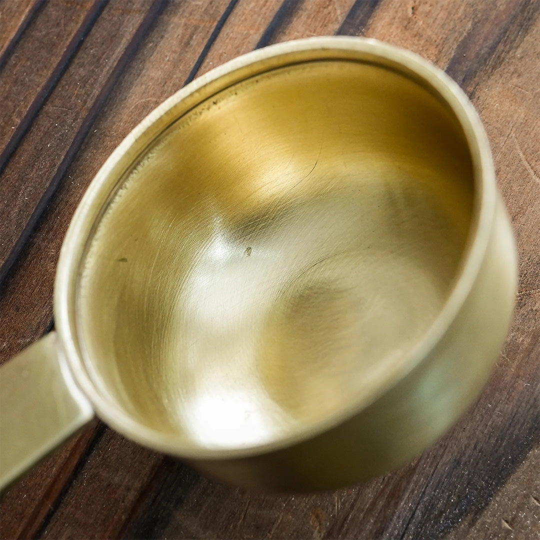 這實在太美了!黃銅勺身配上原木「名栗」手工雕刻手柄,完全打中我的心。第一眼就被那細緻的木紋吸引。所謂「名栗」是日本傳統木工藝,工匠會在材料表面用鑿子手工雕刻出六角形紋理,不僅美觀,還能增加立體感、陰影變化與觸感,甚至具備防蟲效果。