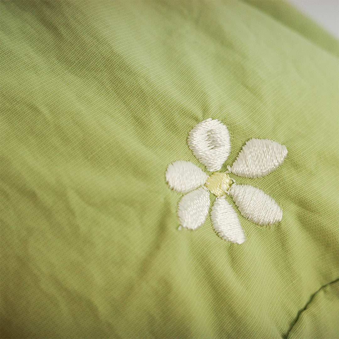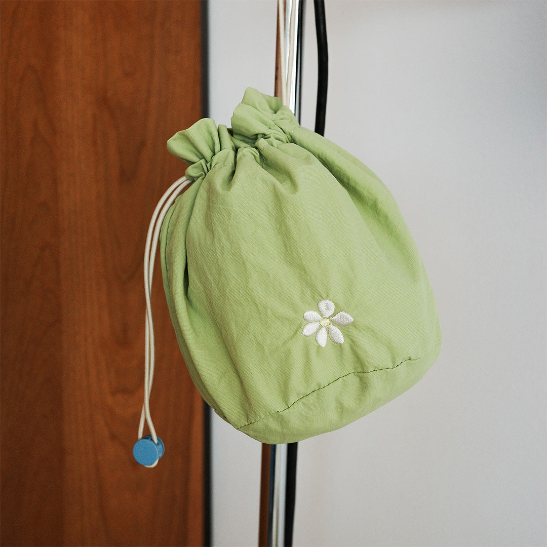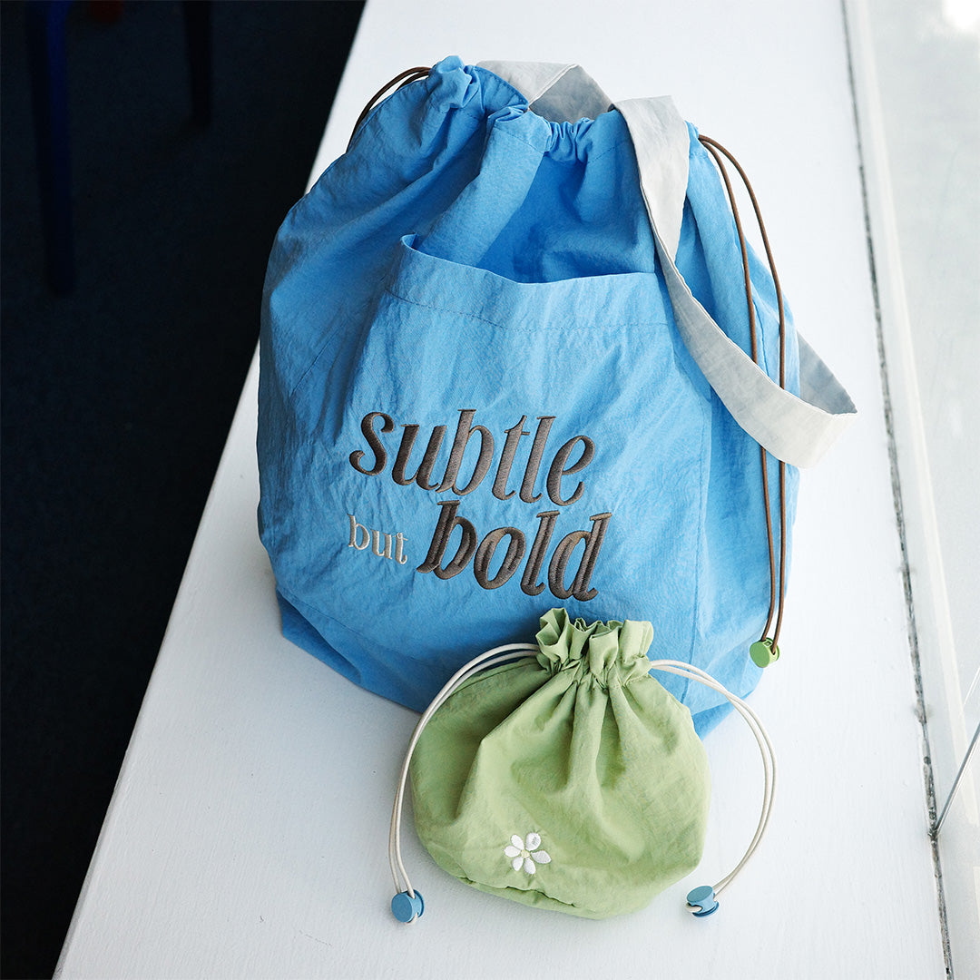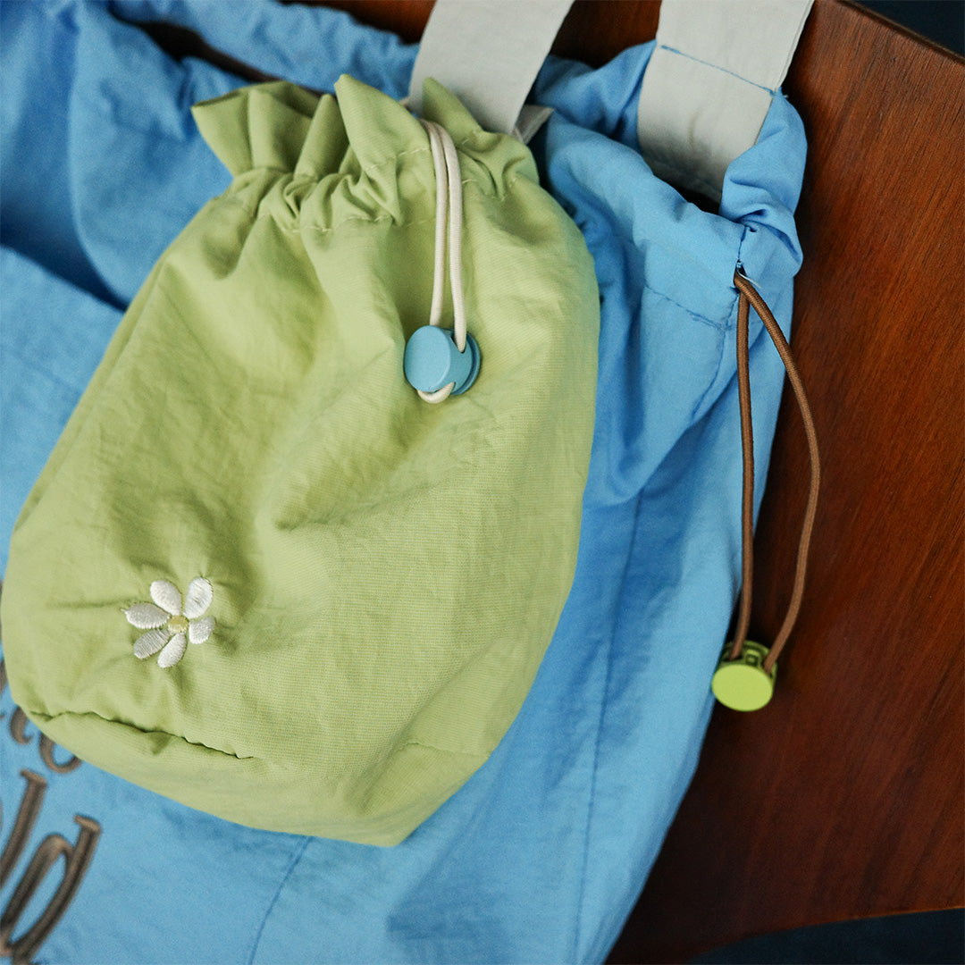 no reason 推出的「小白花草綠束口袋」,與「subtle but bold 防潑水天藍抽繩購物袋」屬於同系列,採用同樣輕薄又防潑水的材質。大小剛好能收納零錢、耳機或隨身小物,輕巧方便;也能當作天藍大包的收納袋,把大包完整收進去。