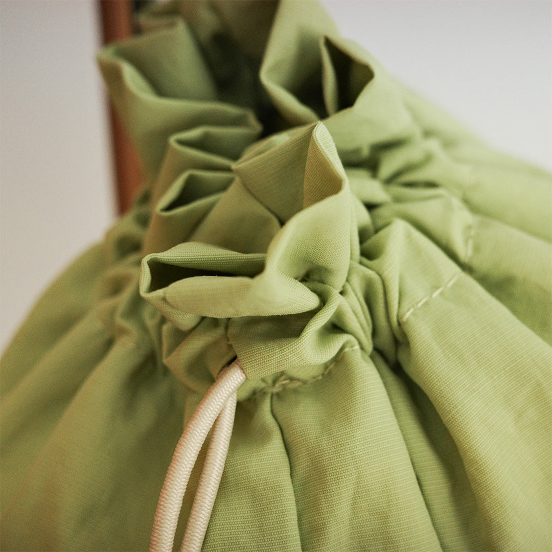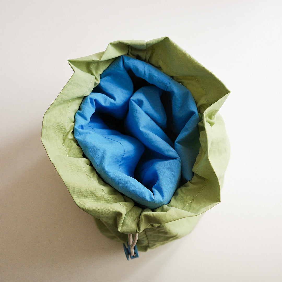 它的配色很討喜,以溫柔的草綠布料搭配米色抽繩與內裡,細節再加上天藍繩釦點綴,和大包互相呼應卻又帶點撞色感,看起來清新耐看。小巧卻實用,單獨使用或和天藍大包一起搭配,都非常合適。