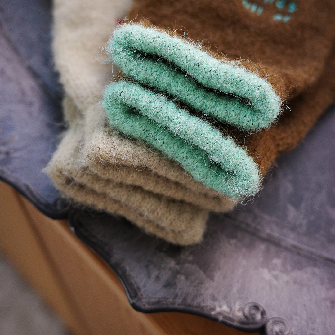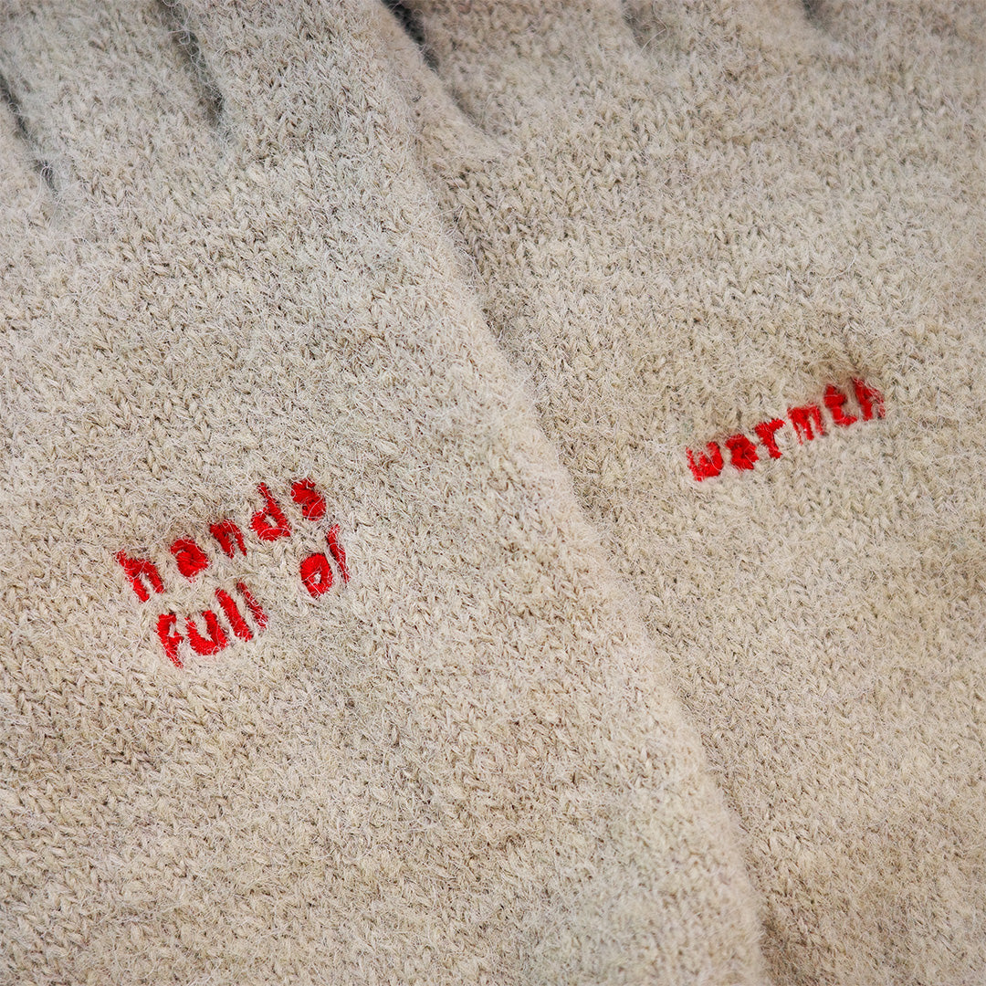 而且最可愛的是手心的刺繡設計。左手寫著 hands full of,右手是 warmth,把「讓雙手暖暖的」這件事直接放在最需要溫度的地方。另外指頭間的開孔設計,有夠可愛又實用的設計,平時滑手機不用在把手套脫來脫去。