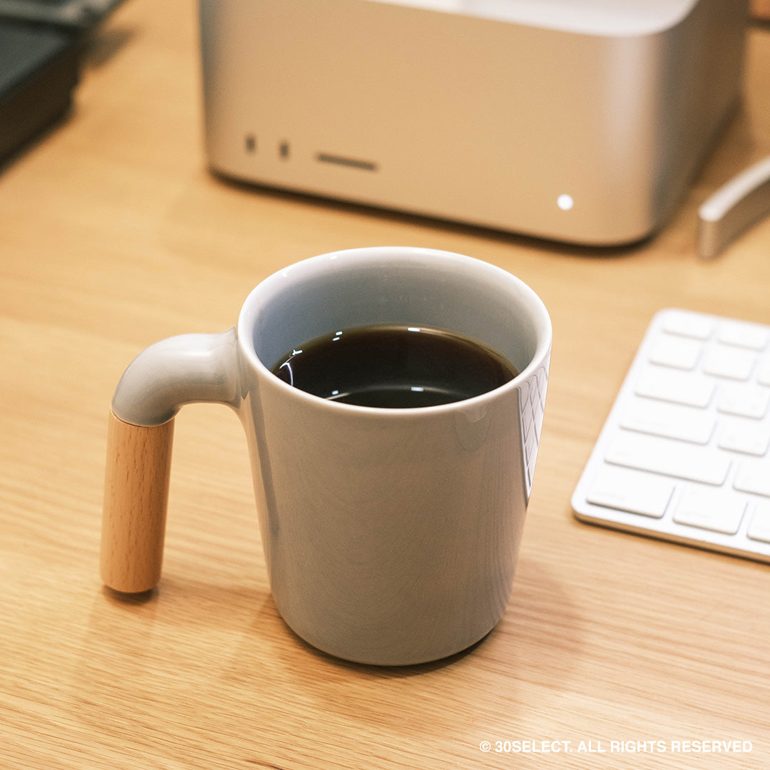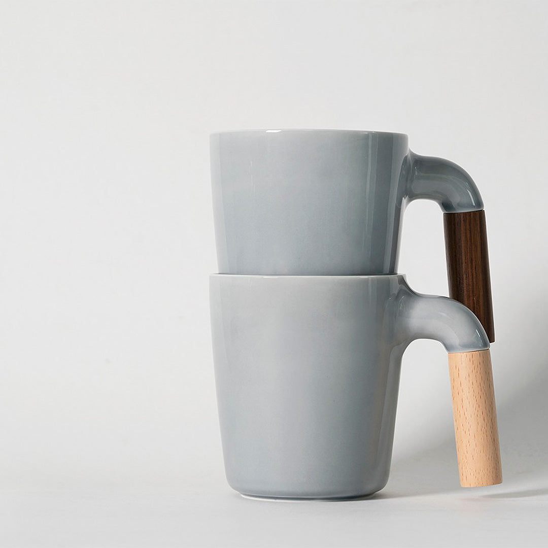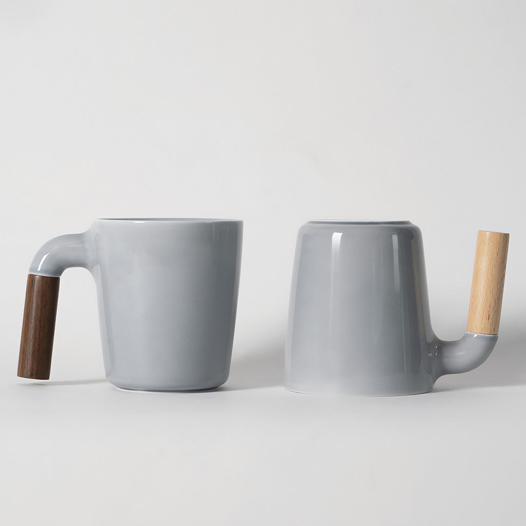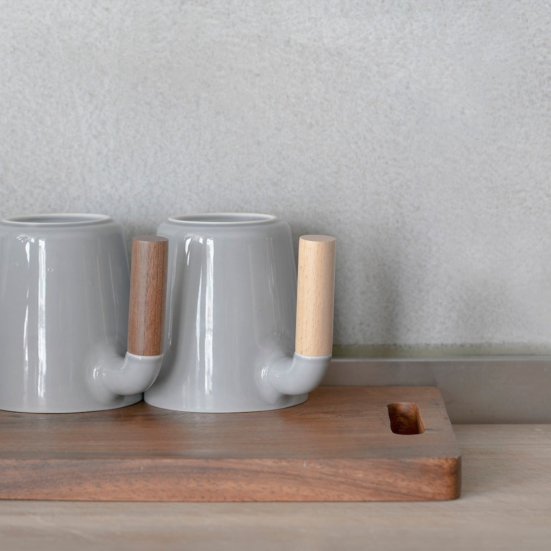 淺灰釉料每一次燒製的流動都是一次創作,在杯身產生有如雲霧般的濃淡,杯體光滑的釉面,利於清潔,咖啡與茶不留杯底。除了釉面不同,這次把手也多了新選擇,共有深胡桃木與淺櫸木兩種。