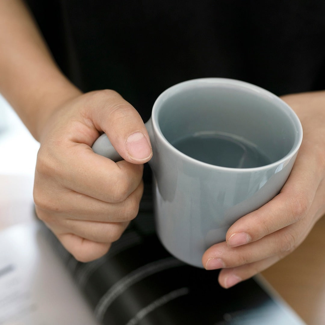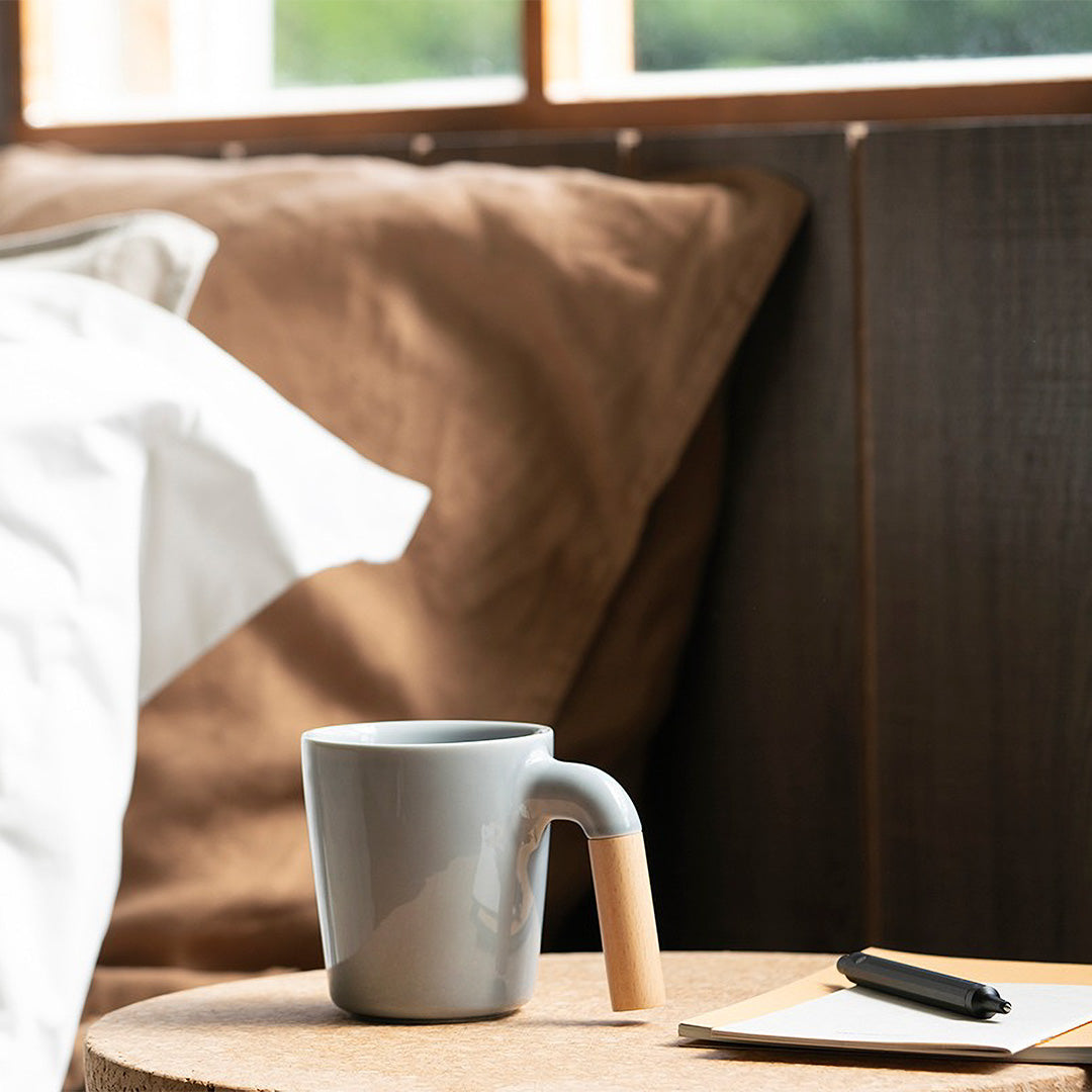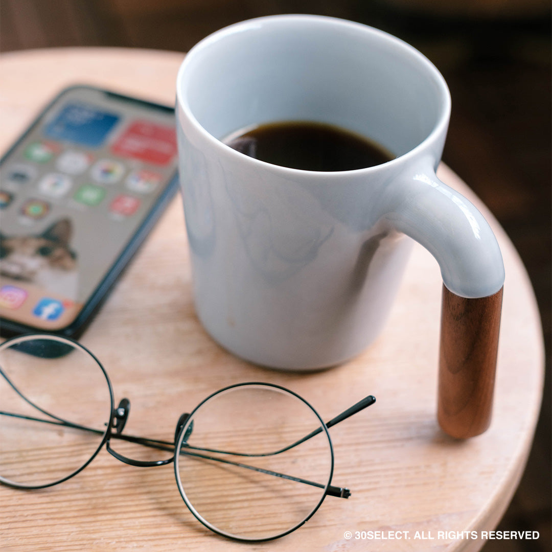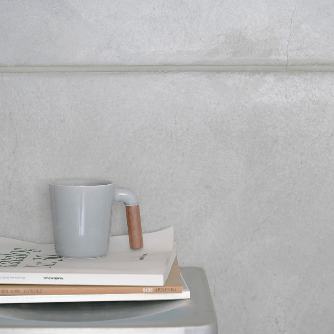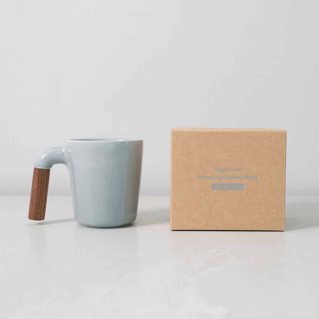 淺灰釉料每一次燒製的流動都是一次創作,在杯身產生有如雲霧般的濃淡,杯體光滑的釉面,利於清潔,咖啡與茶不留杯底。除了釉面不同,這次把手也多了新選擇,共有深胡桃木與淺櫸木兩種。