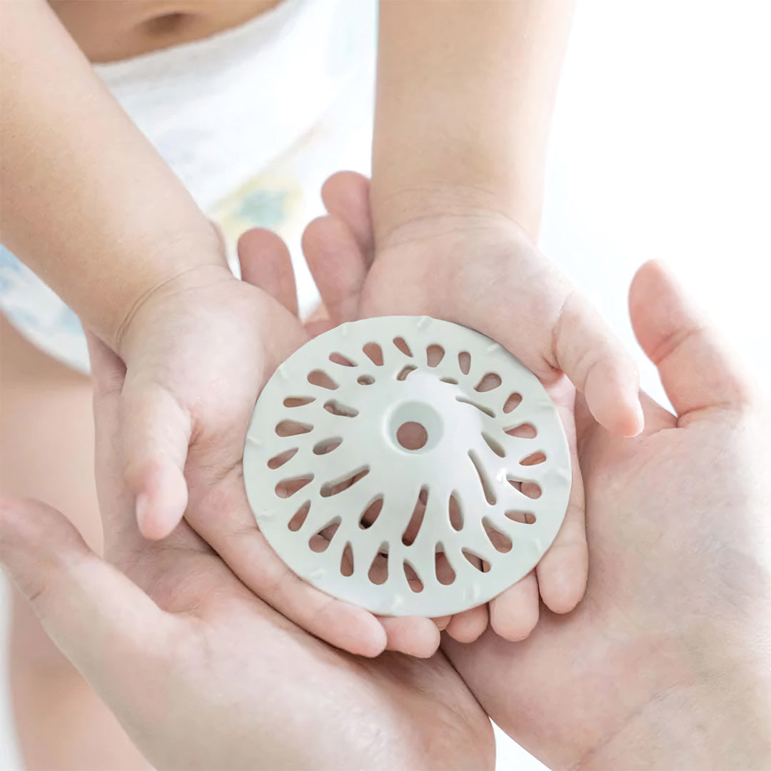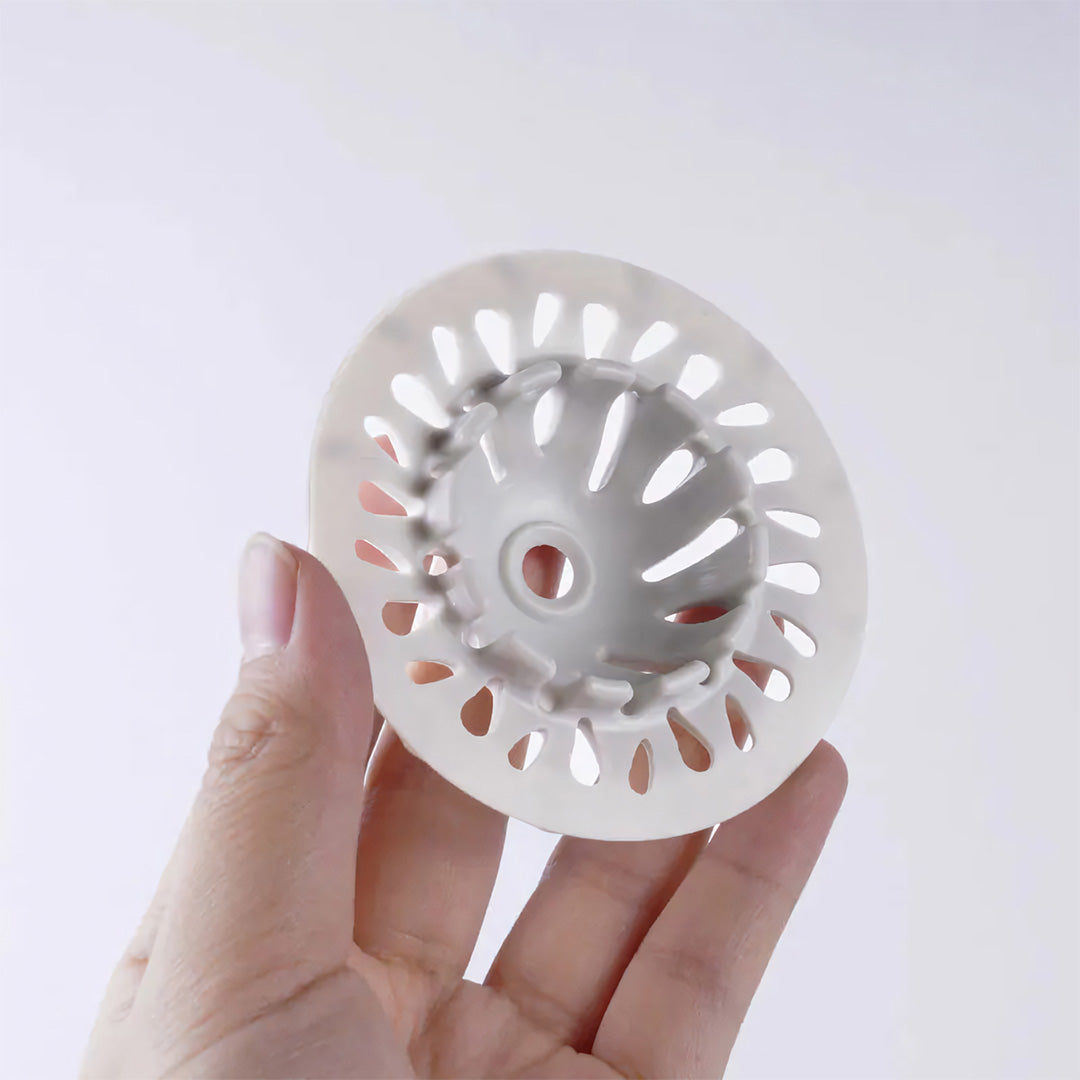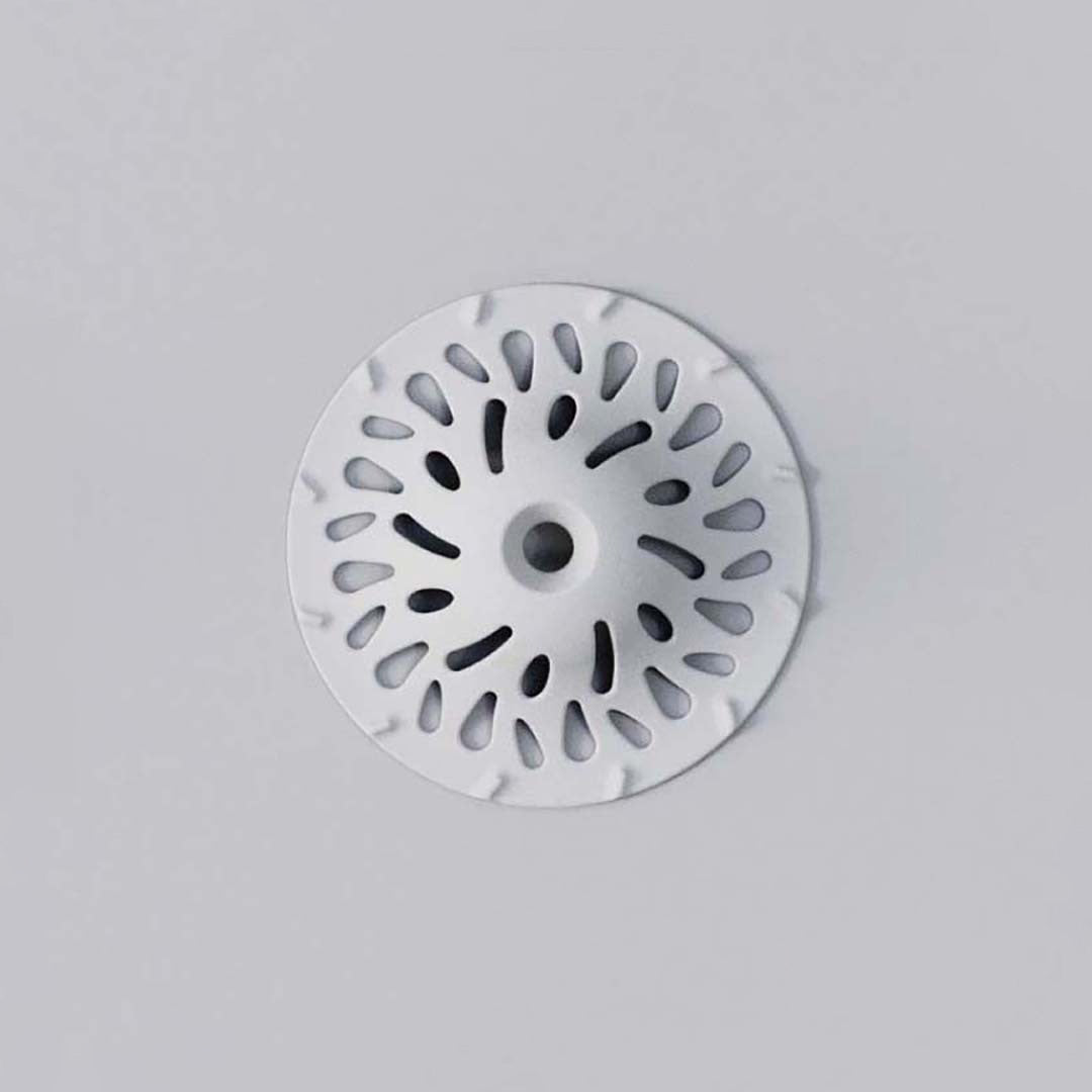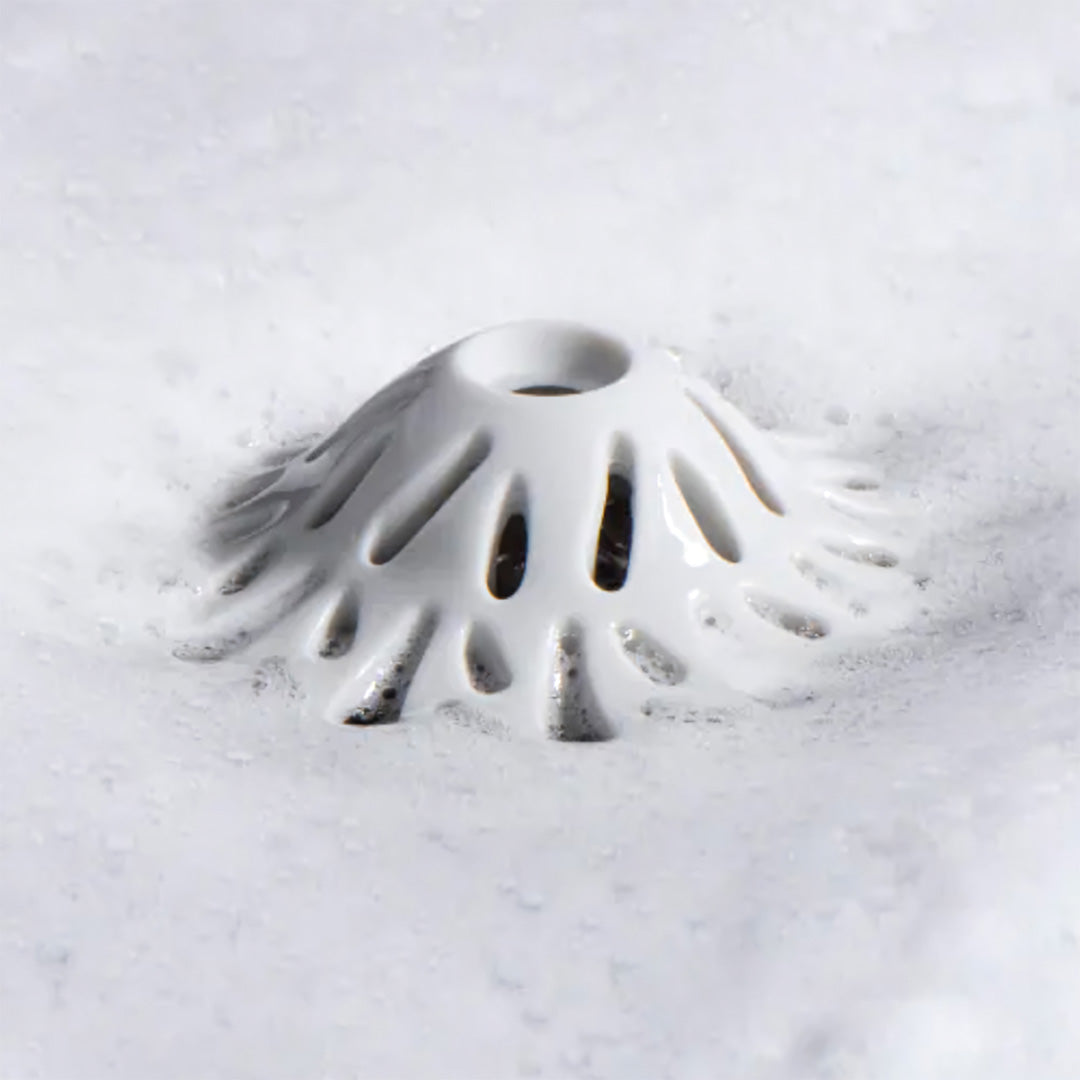 它被暱稱為「小浴山」,造型靈感來自山體,曲面結構會自然引導排水方向,把毛髮集中攔截,減少進入水管的機會。外層的滑順塗層讓毛髮不易沾黏,用手一捏就能整團拿起來丟掉。內層則是經過拋光處理的矽膠材質,吸附力強、止滑效果好,不容易被水流沖走。