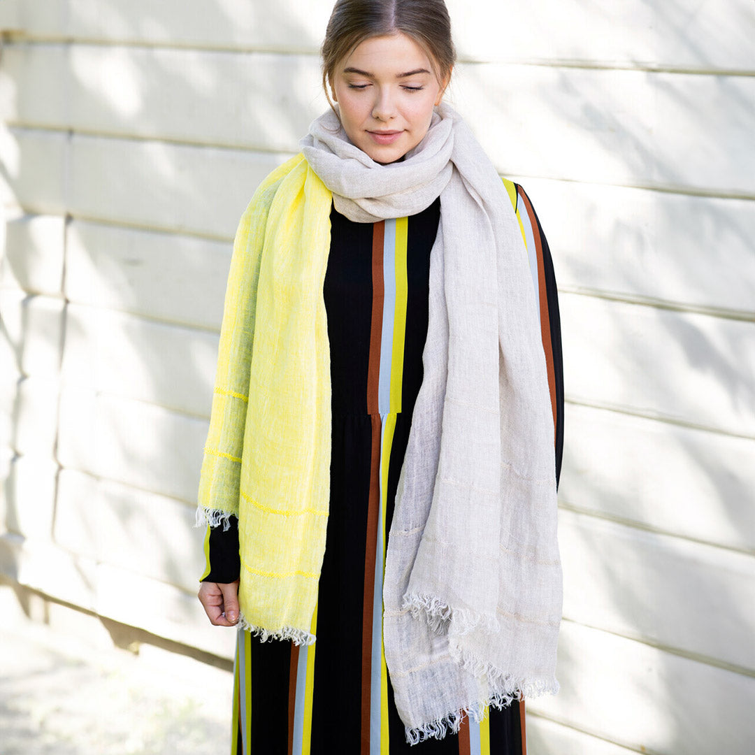 除了頂級羊毛製品外,Lapuan Kankurit另一個明星系列商品,就是高品質亞麻織品。此款亞麻薄圍巾,採用100% 水洗過的亞麻製成,自然的皺褶與親膚柔軟的質地,讓人一用就愛上。