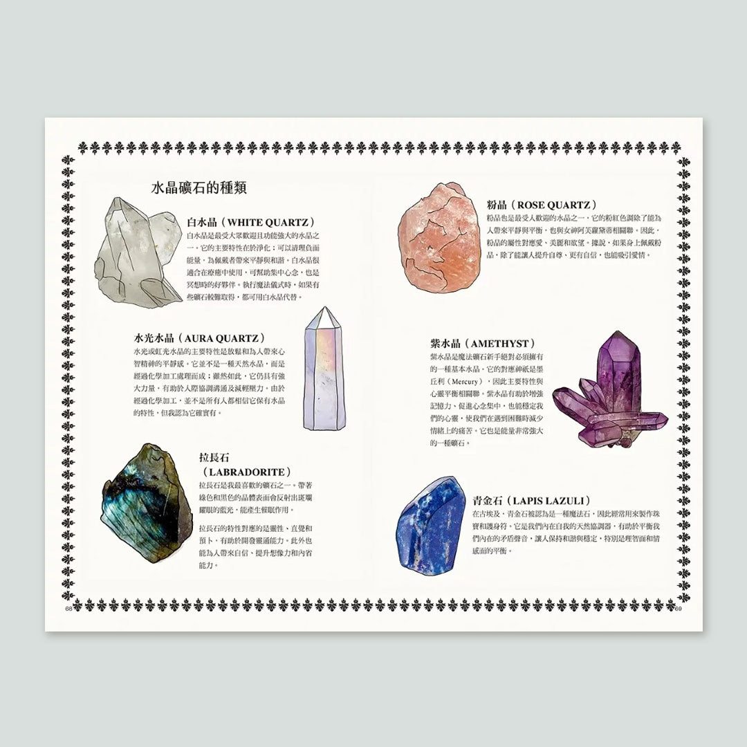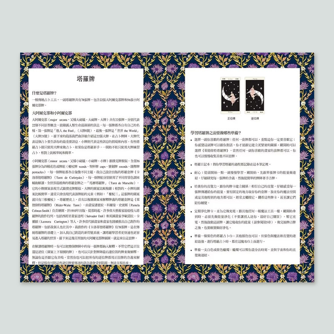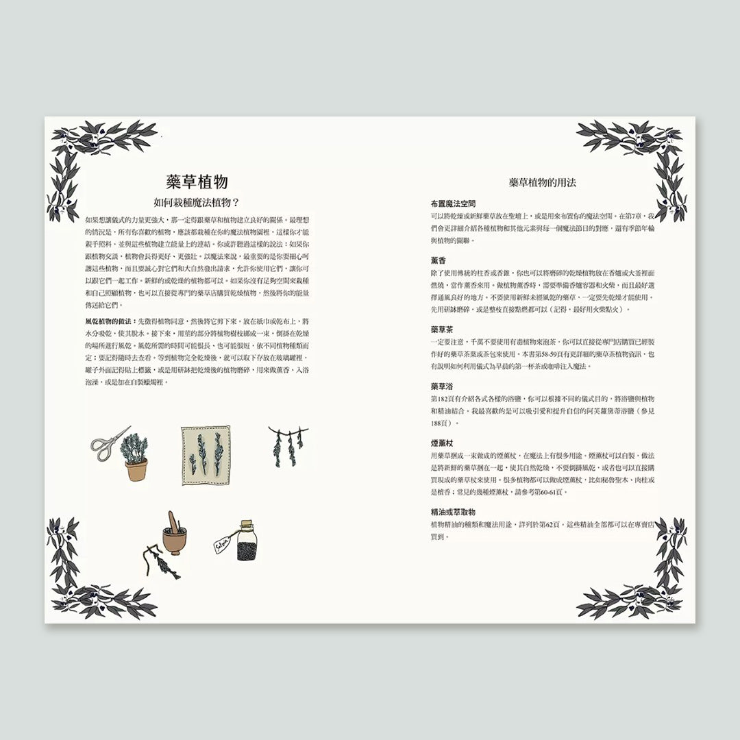 書中涵蓋了從神聖空間的佈置、藥草與礦石的能量、節氣與占卜的基礎、簡單的月亮儀式與塔羅牌練習,甚至連日常生活中點蠟燭、許願、與自然連結的方式,也都一一說明。它不告訴你該怎麼做,而是給你一種自由探索的可能——讓你學會傾聽直覺,找到與自己最契合的魔法路徑。