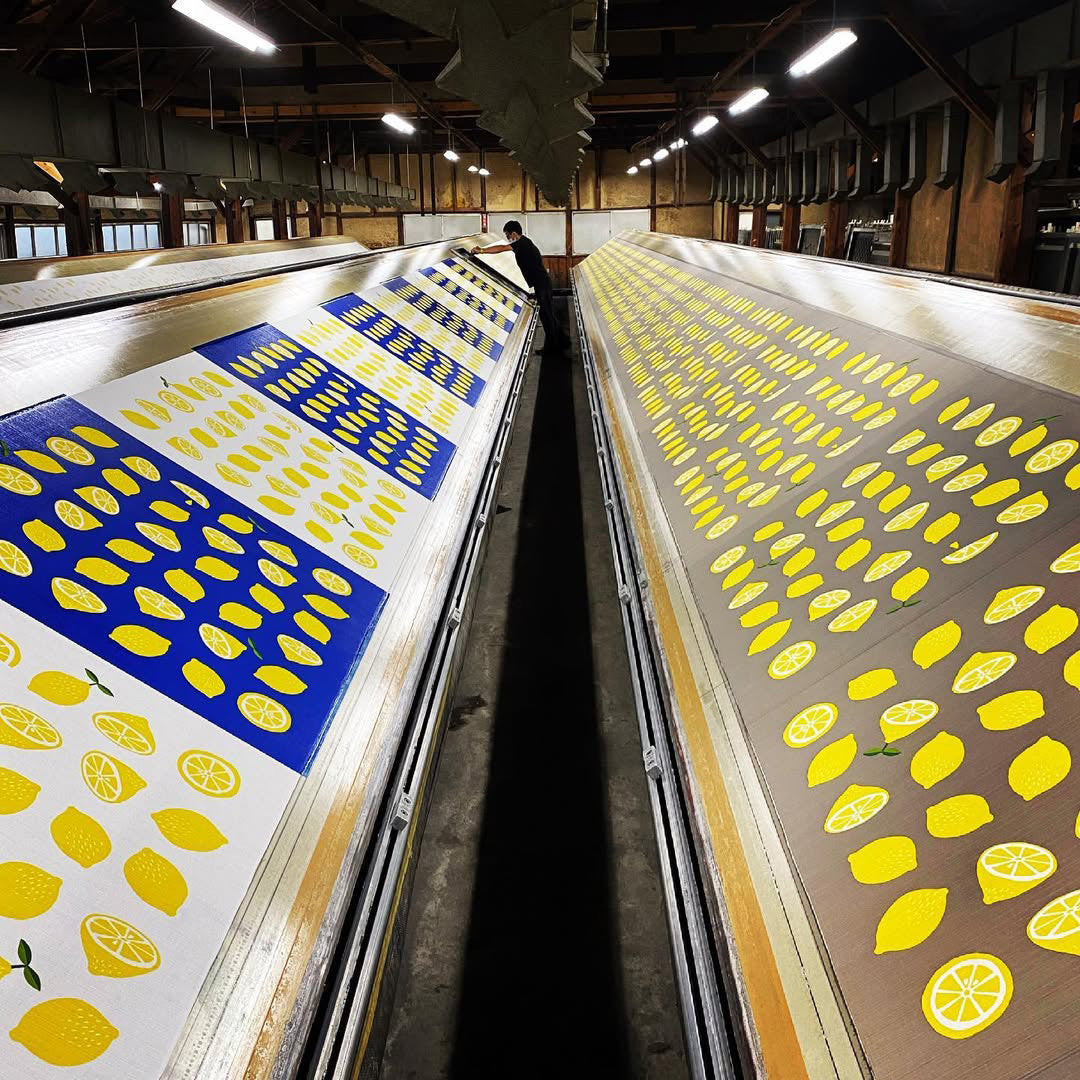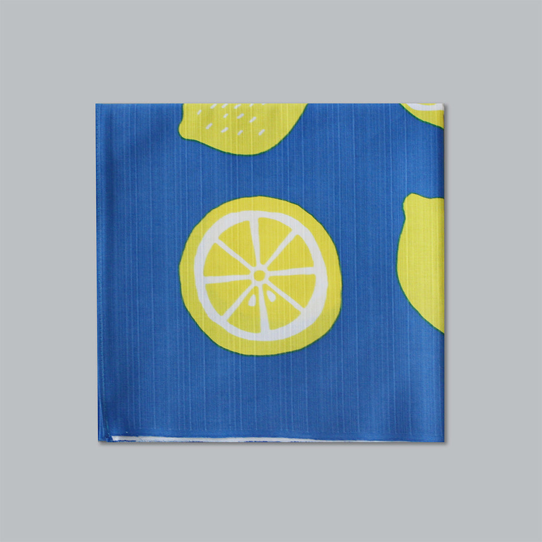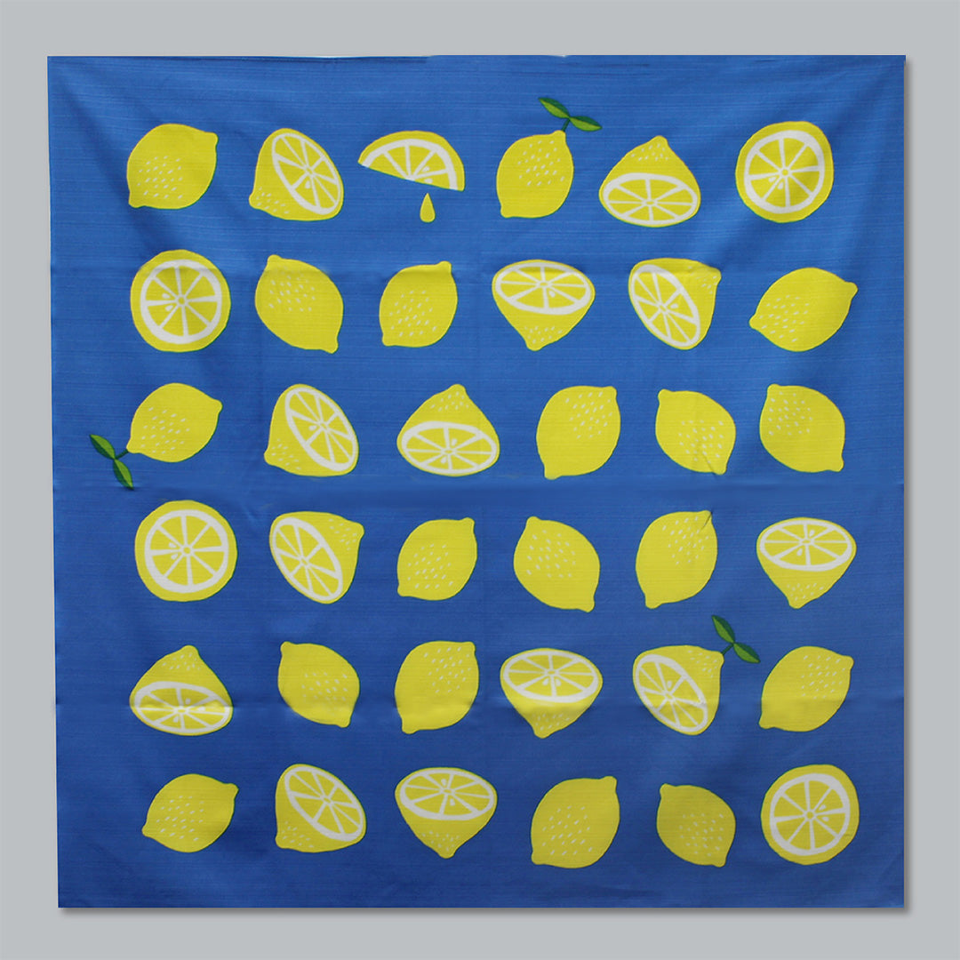 這款約 90cm 大小的風呂敷,以檸檬為主題設計。檸檬的花語是「熱情」,mashu 希望透過這個圖案,傳達歡喜雀躍的感覺,讓擁有它的人每天都能感受到好心情。
