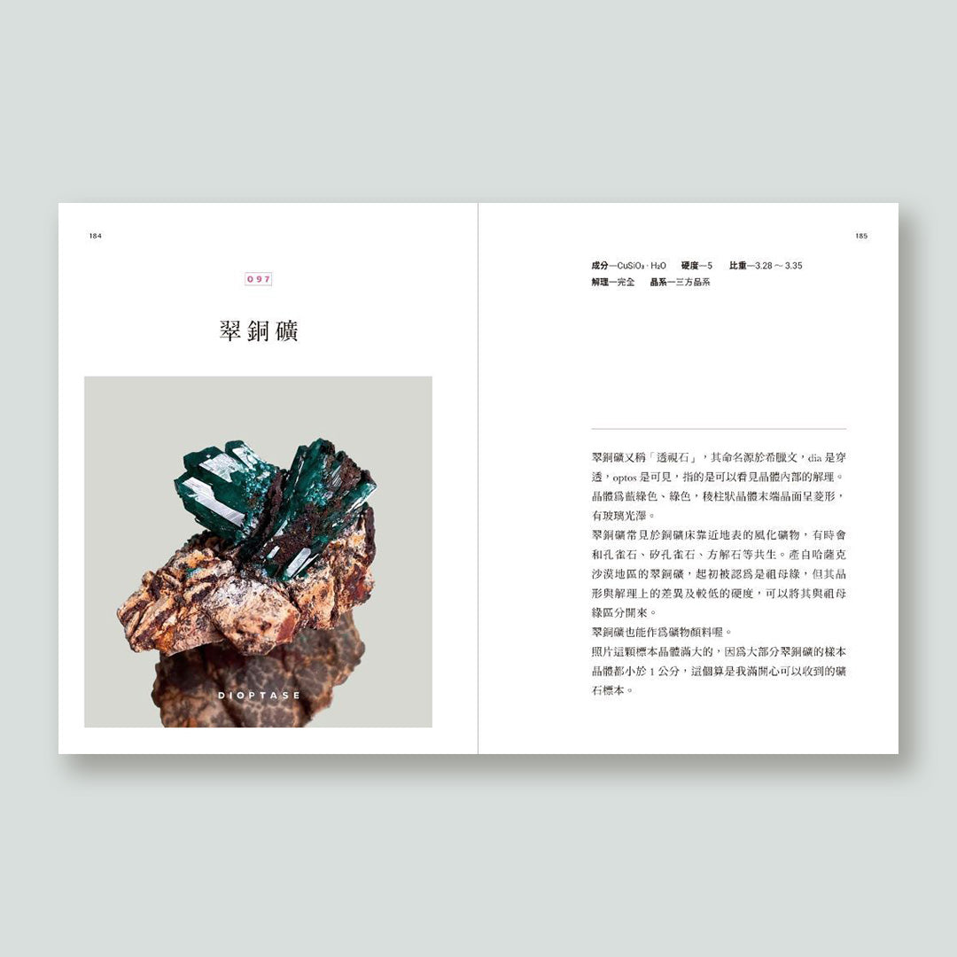 圖鑑篇:依色彩呈現多種原礦,搭配鏡面反射攝影,全方位賞析礦石之美,並補充知識。