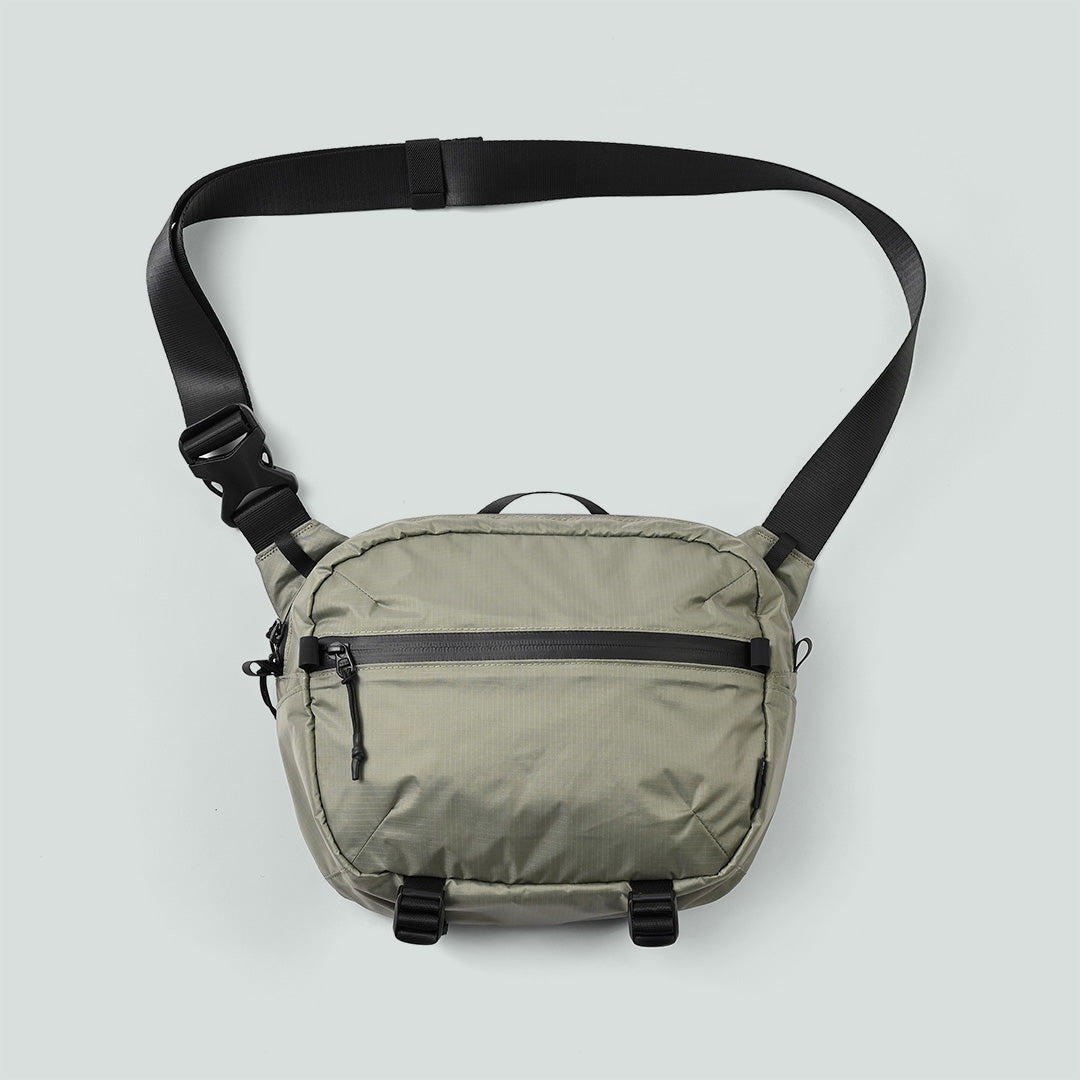 MS1 斜背包以輕量設計為核心,適合通勤、騎乘與旅行。擁有5.8L大容量,包型圓潤且側邊收窄,兼具中小型包的外觀與大容量的收納功能。採用210D輕量格紋尼龍與YKK防水拉鍊,僅重230g,具備防潑水性能。內部設有多層收納空間,包含主袋、前置拉鍊袋及背面透氣拉鍊袋,兩側還有彈性網布袋,方便快速取物。