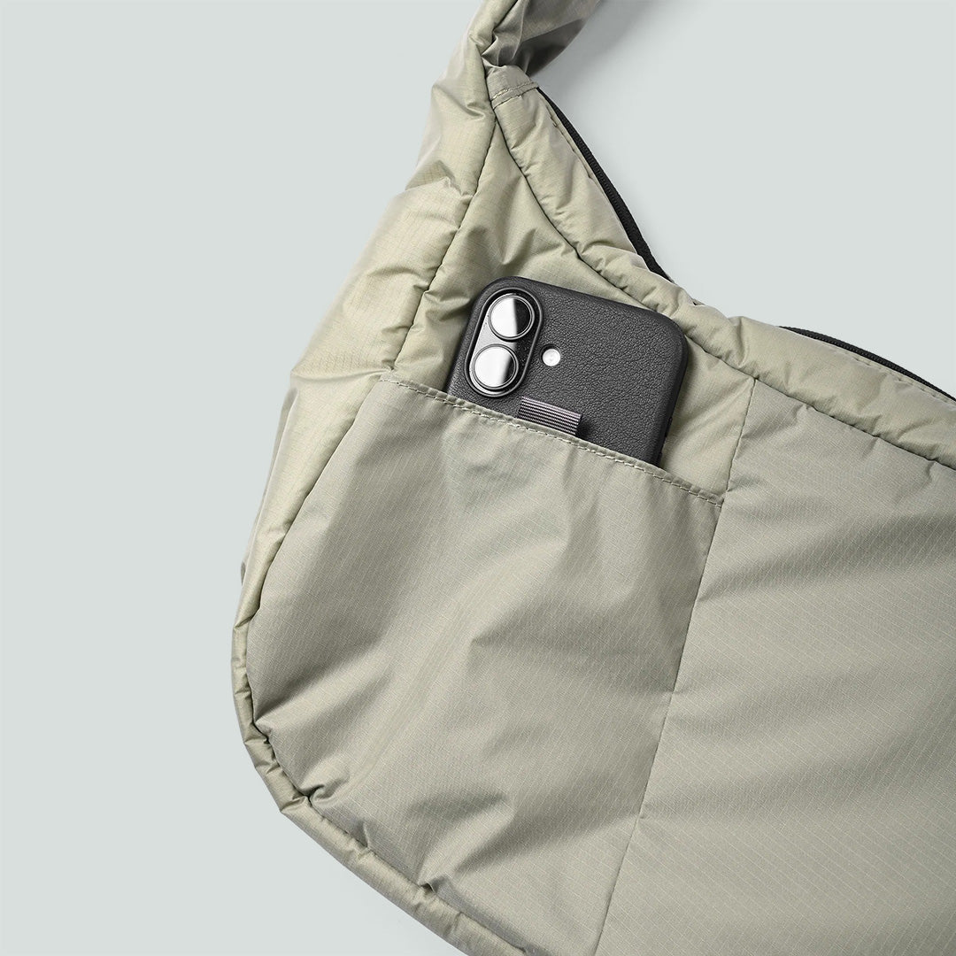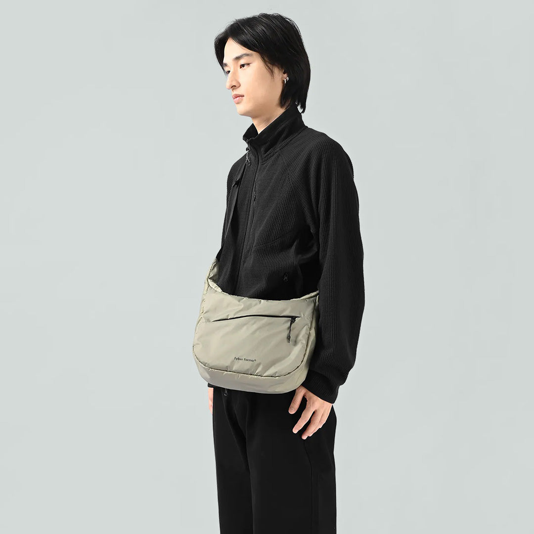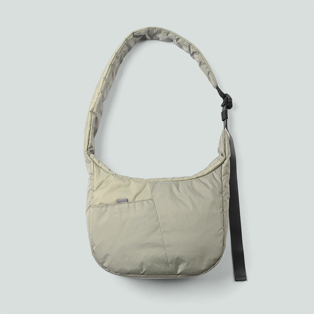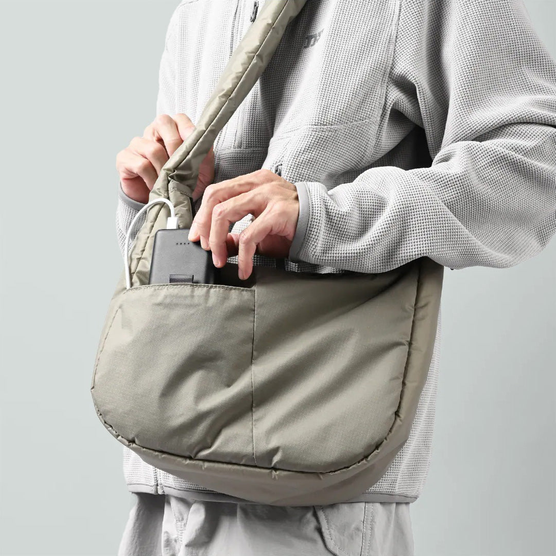 全包體的輕鋪棉設計,摸起來帶點蓬鬆感,手感柔軟又有質感。包型圓潤俐落,肩背或斜背都自然有型,搭配極簡線條與機能感防潑水材質,穿搭瞬間更有層次,喜歡機能低調風格的朋友一定會愛。