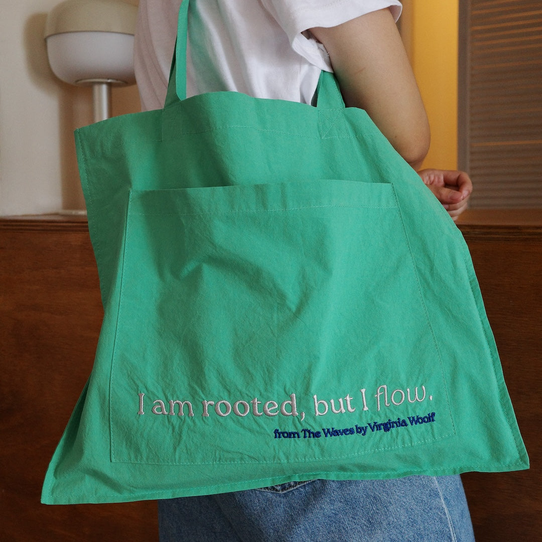 「Rooted, but Flow 輕巧購物袋」中,以20世紀英國最具影響力的現代主義作家 維吉尼亞·吳爾芙Virginia Woolf的名作《海浪 The Waves》為設計靈感,將書中這句美麗的語句「Rooted, but Flow」細緻地刺繡在購物袋上,配上清雅的「仙綠」和「灰白」兩種顏色,賦予了它獨特的文學氣息。