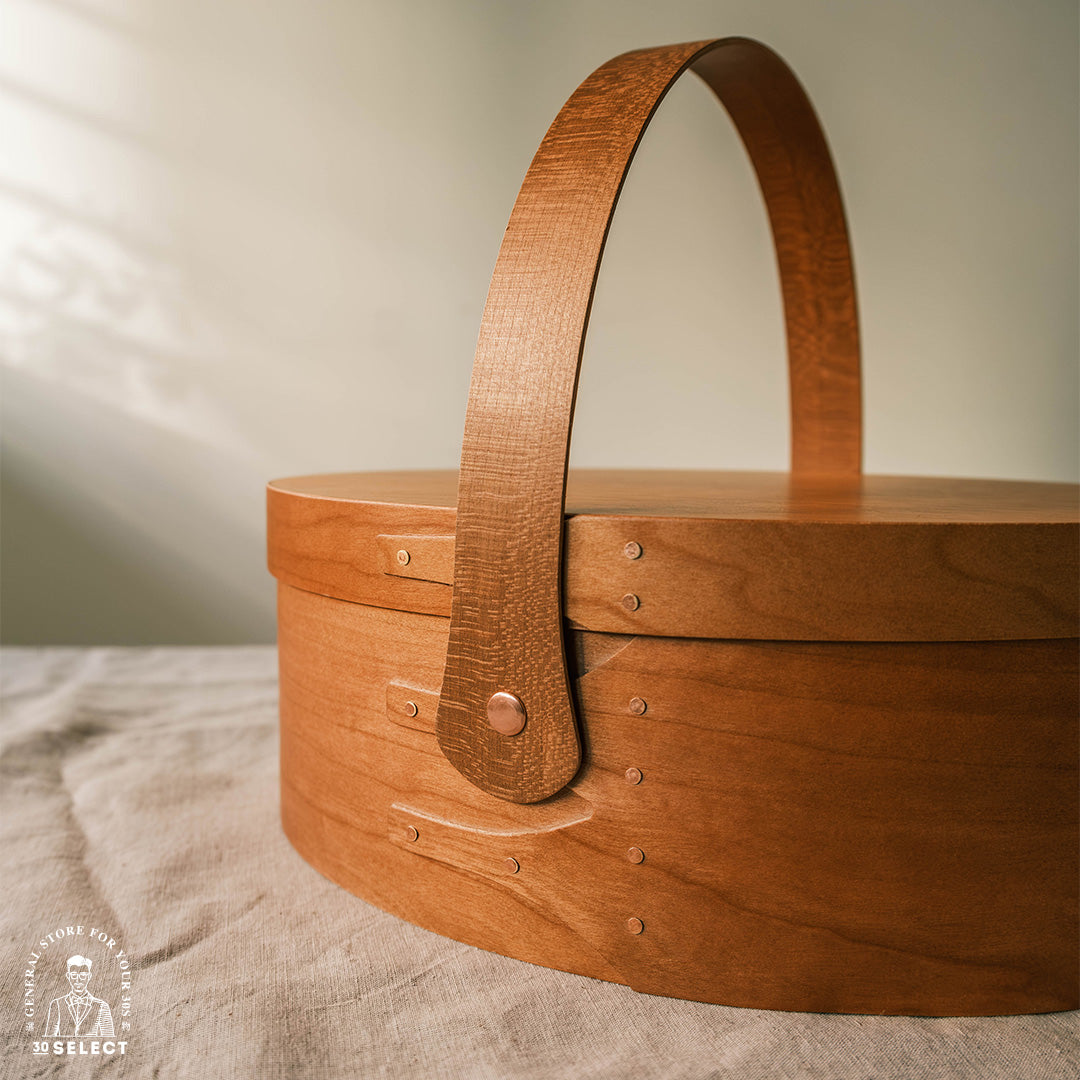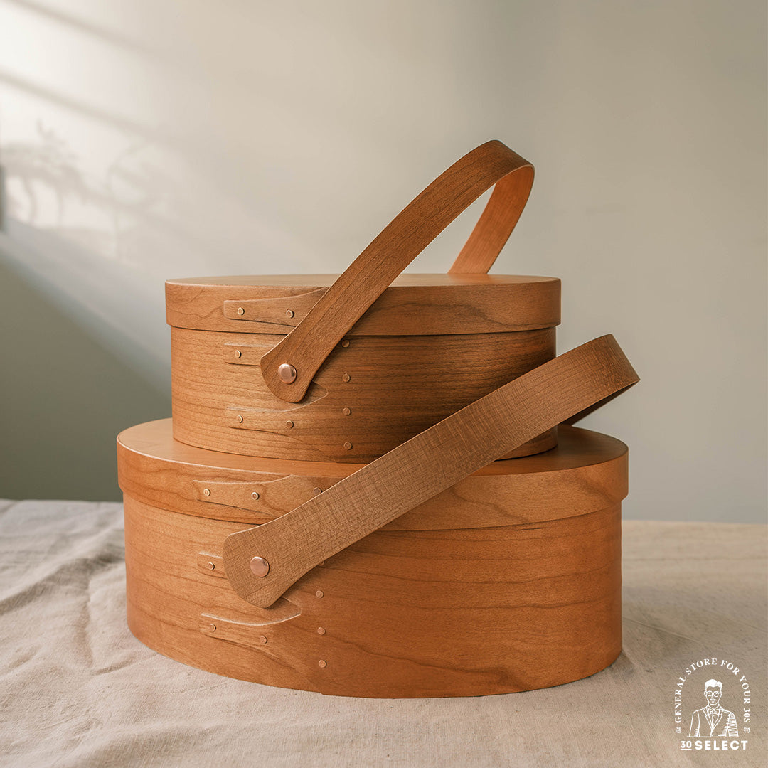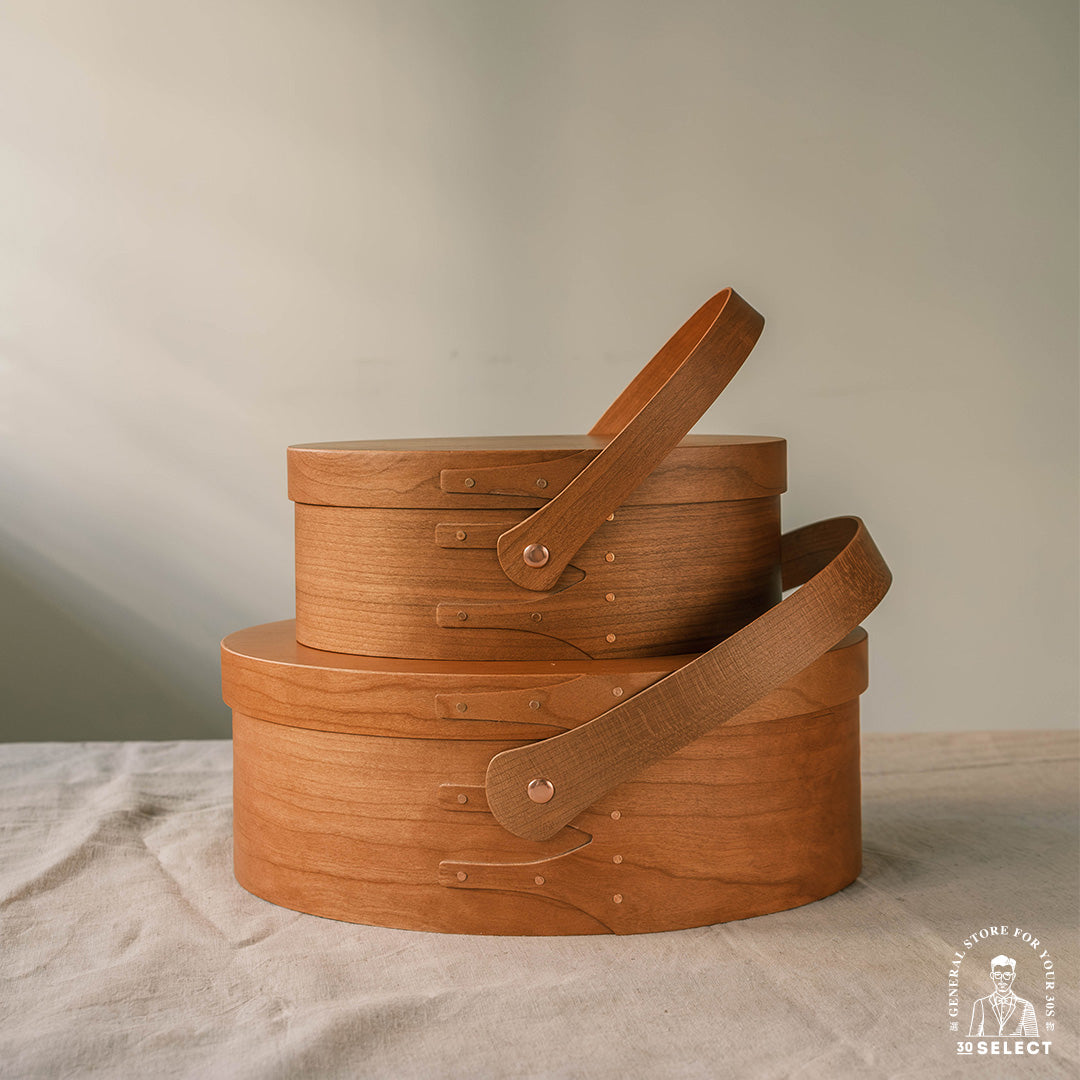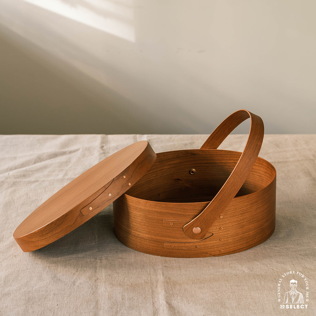 起源於美國十八世紀末的基督教夏克教派(The Shakers),以其簡潔的設計和優雅的曲線而聞名。採用薄木板彎曲成型,並透過木皮纖維錯位工法,以銅釘接合與固定,無使用任何黏著劑。這樣的製作方式使得即使在溫度和濕度變化時,也不易變形或破裂。同時,這種特殊的製作方法賦予了木盒優美簡約的外觀,讓人為之著迷。
