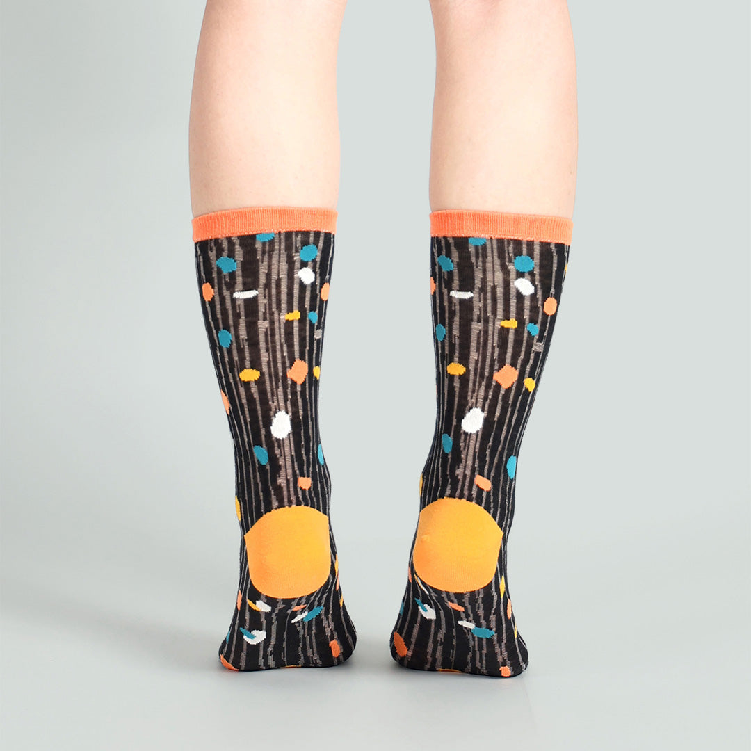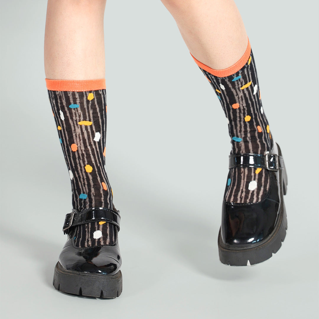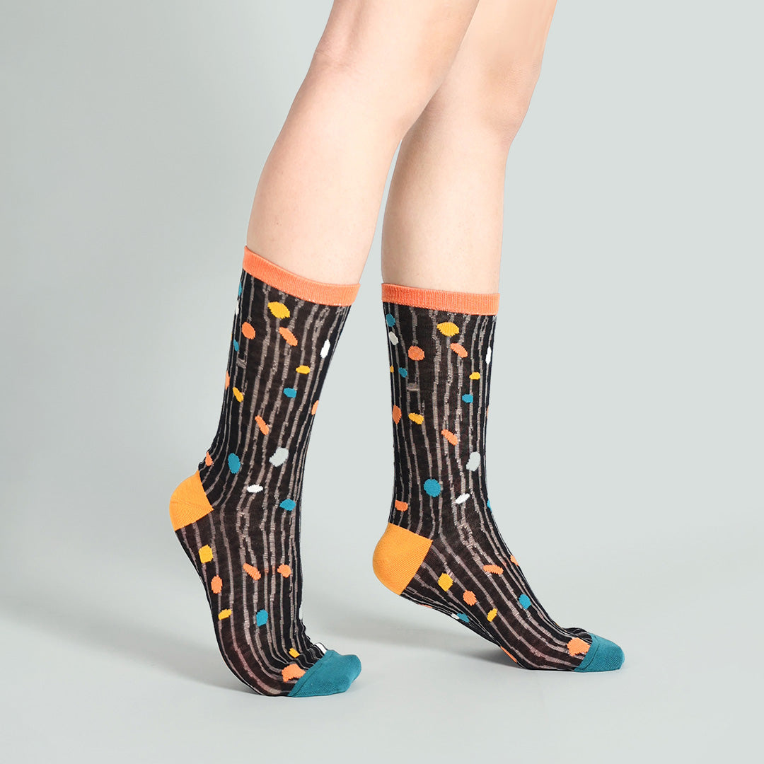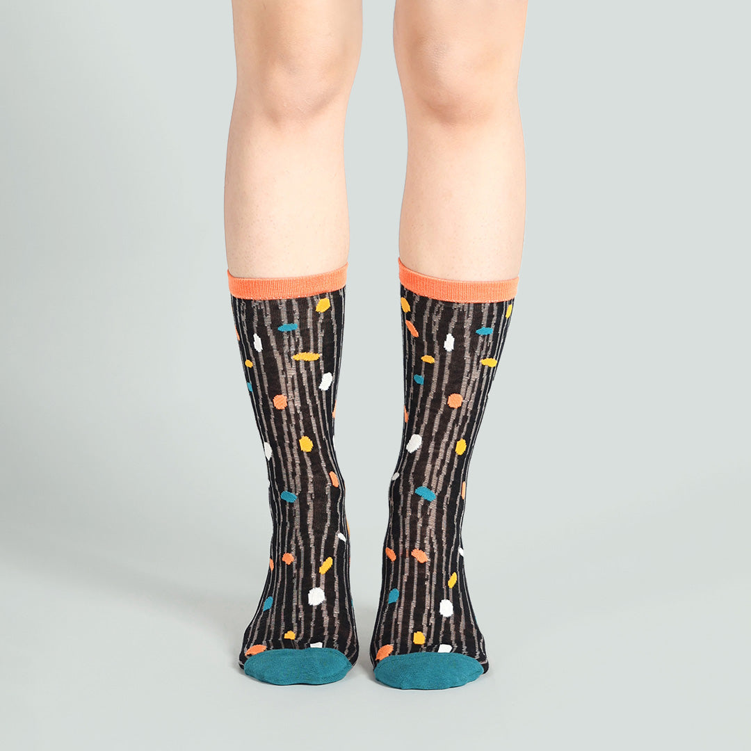 襪子不只是必需品,也能是一件日常的小藝術。這款透紗中筒襪,以鮮明大膽的配色與圖案,搭配高品質棉紗編織,不僅舒適耐穿,也替日常穿搭多了幾分趣味。