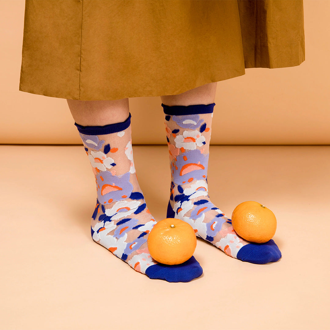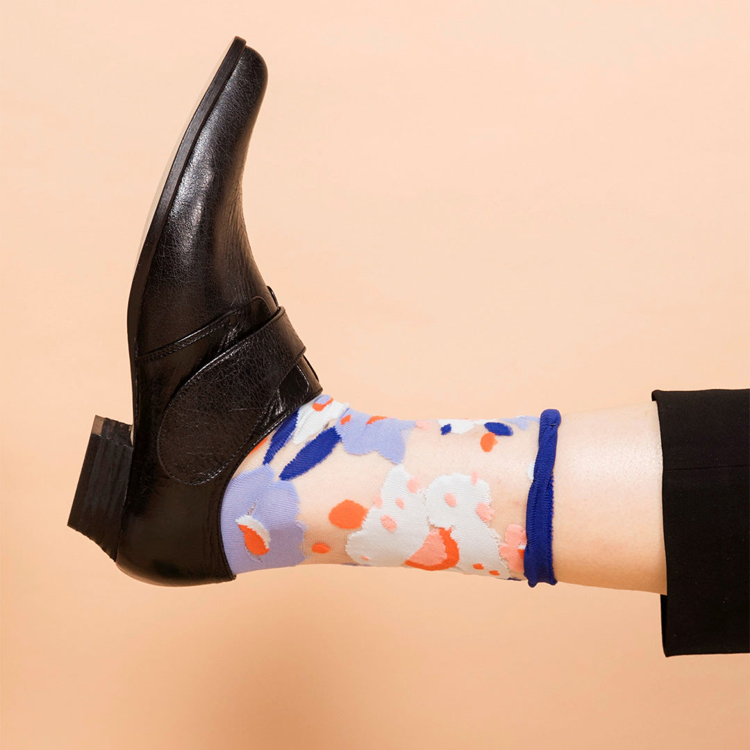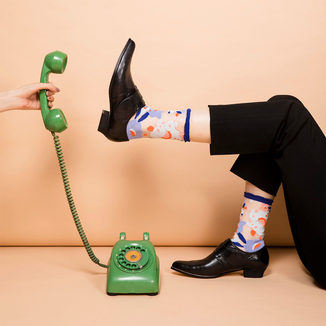 襪子不只是必需品,也能是一件日常的小藝術。這款透紗中筒襪,以鮮明大膽的配色與圖案,搭配高品質棉紗編織,不僅舒適耐穿,也替日常穿搭多了幾分趣味。