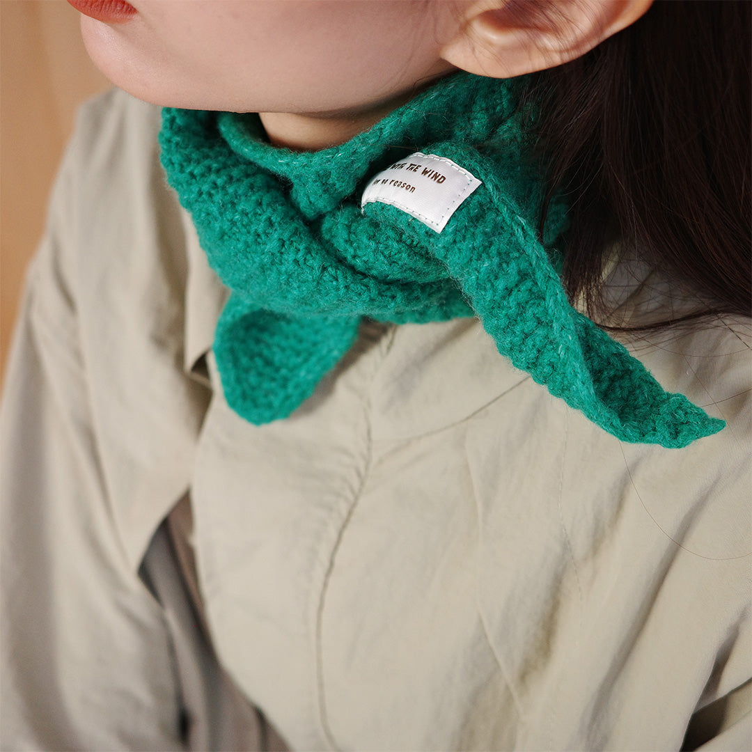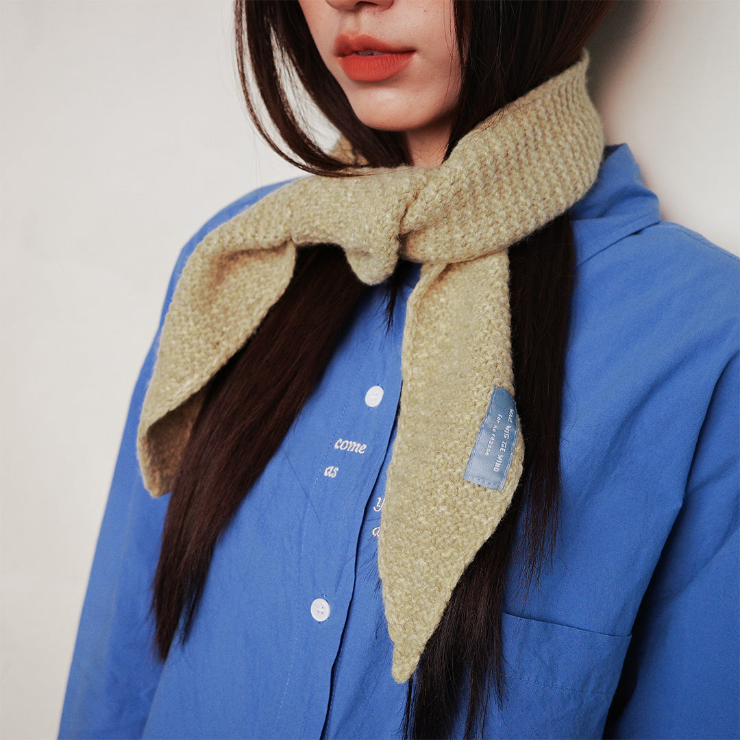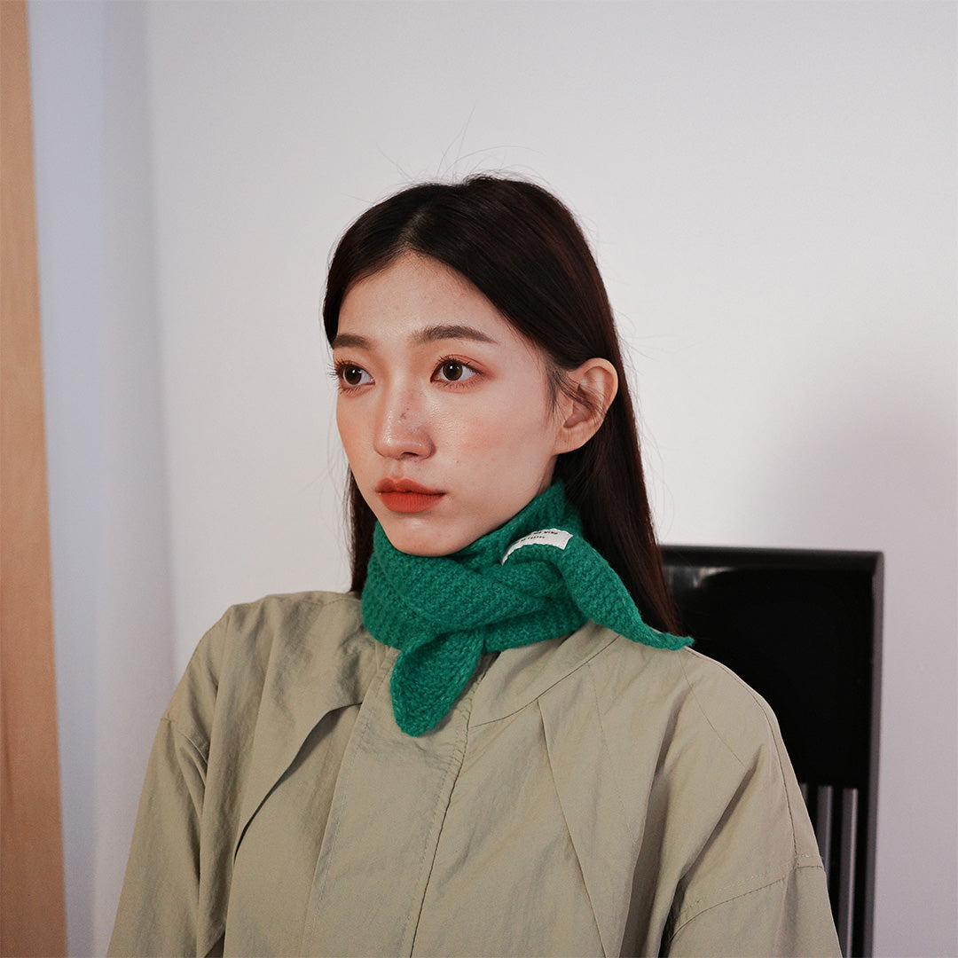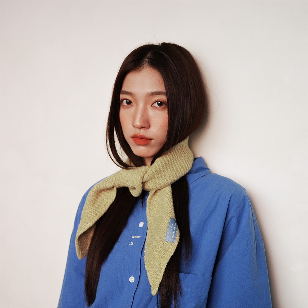 不同於厚重的大圍巾,它是比較窄、比較短的新版型,兩端收成尖尖的樣子,繞在脖子上特別俐落。隨手繞一圈打個結就很好看,想要更有型一點也可以打兩次結,甚至繞到頭上、結打在下巴下方,瞬間多一點可愛感。保暖之餘,也是一個替穿搭加分的小裝飾。