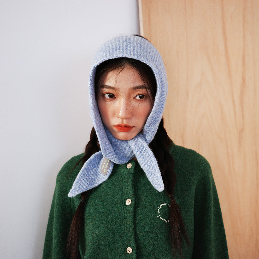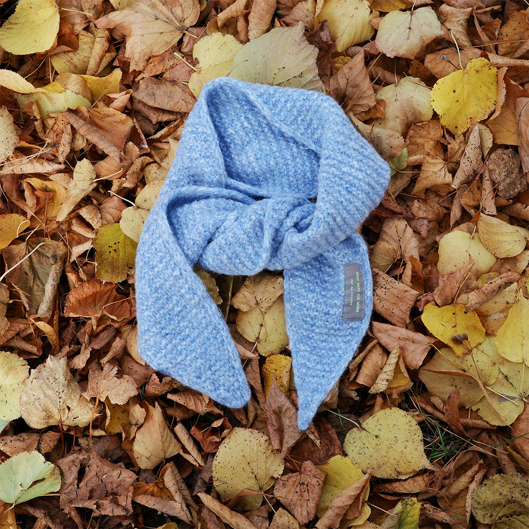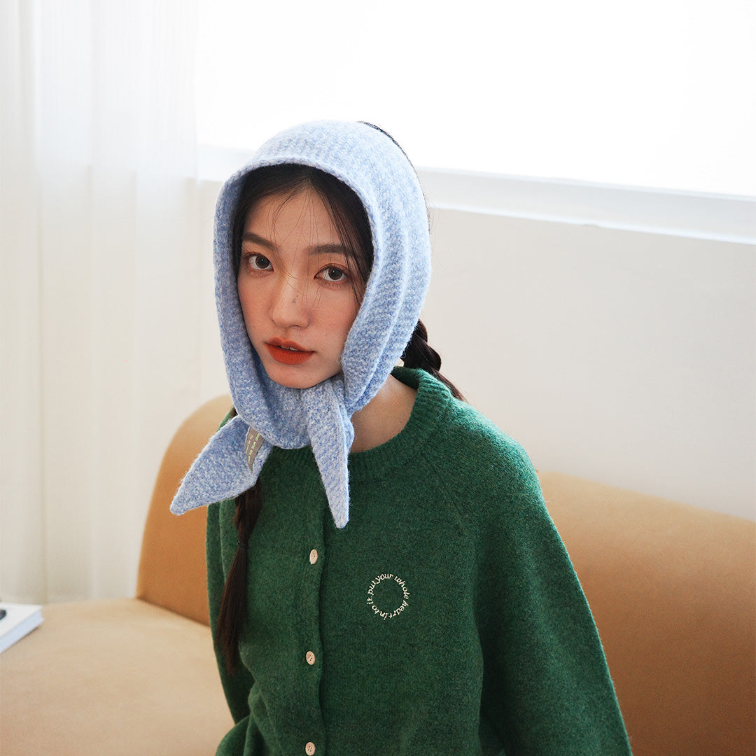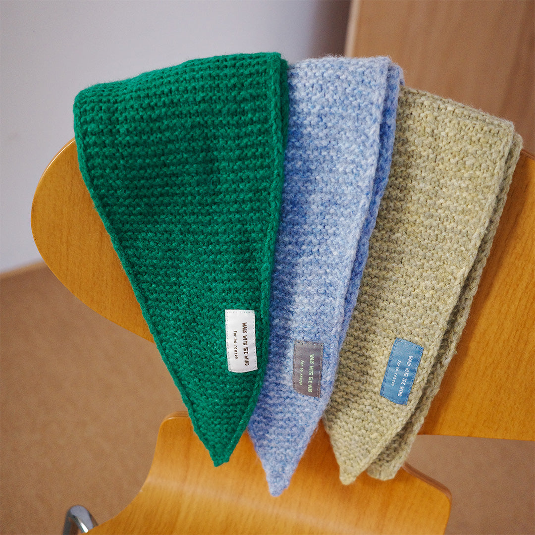 不同於厚重的大圍巾,它是比較窄、比較短的新版型,兩端收成尖尖的樣子,繞在脖子上特別俐落。隨手繞一圈打個結就很好看,想要更有型一點也可以打兩次結,甚至繞到頭上、結打在下巴下方,瞬間多一點可愛感。保暖之餘,也是一個替穿搭加分的小裝飾。