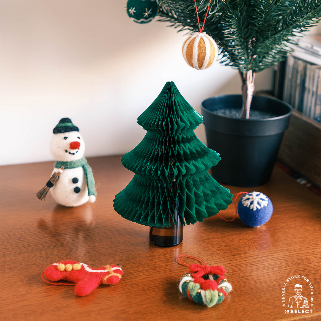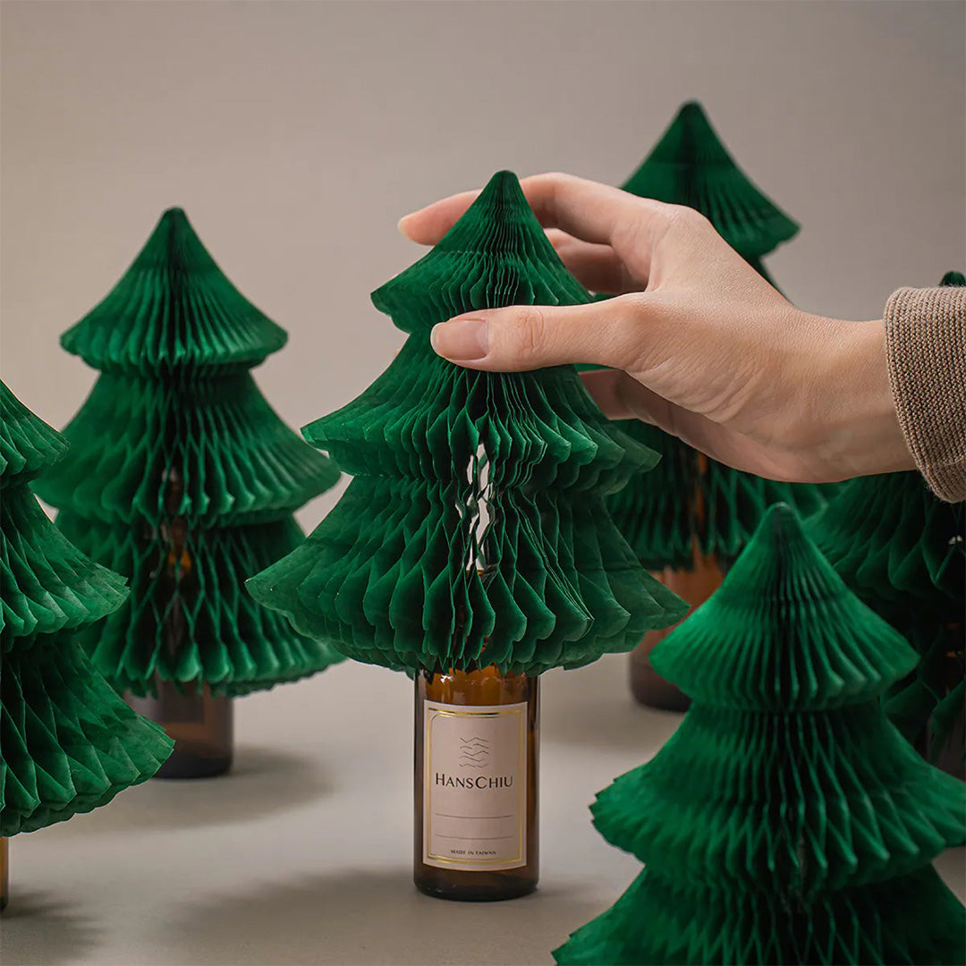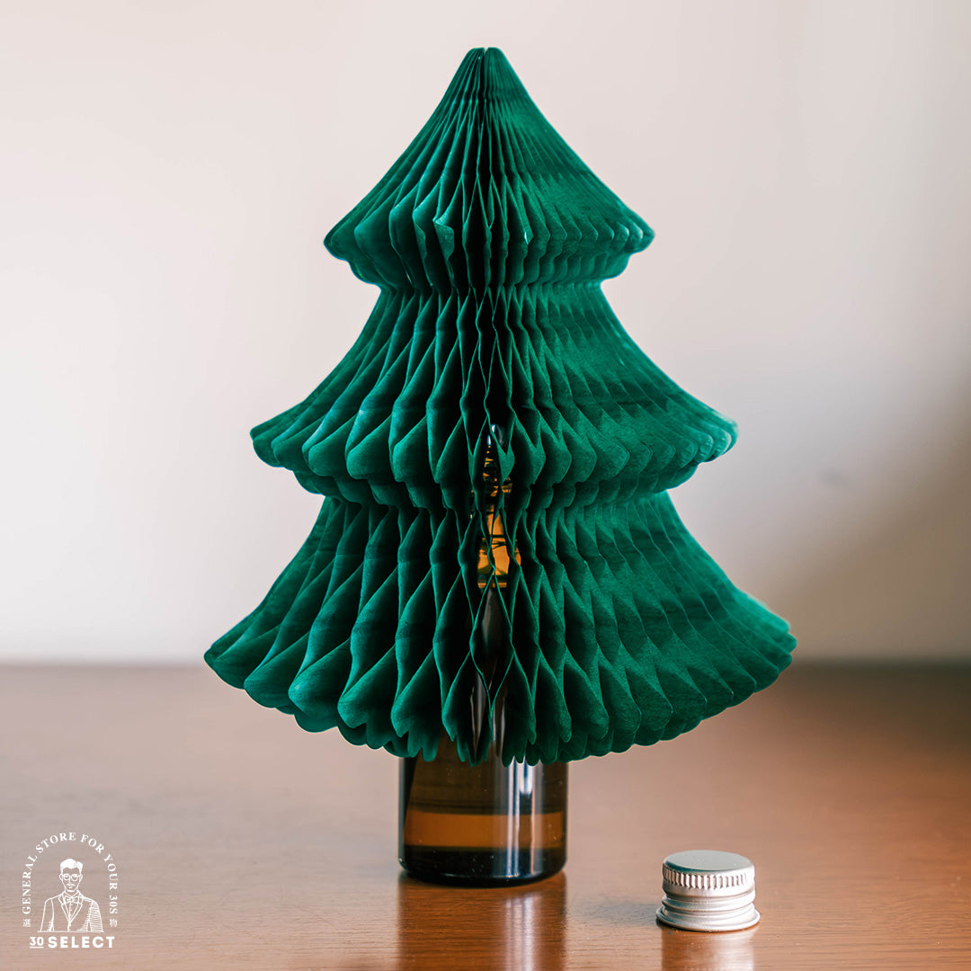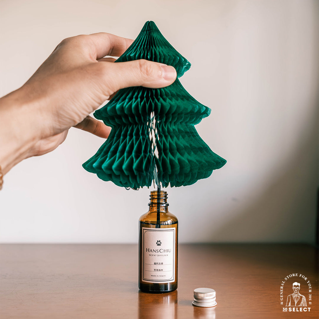 由台灣品牌 HANSCHIU 推出的耶誕禮盒,把摺紙藝術做成一棵迷你耶誕樹,結合擴香瓶一起呈現,不只外型可愛,也能讓香氣自然地在空間裡慢慢展開。小小一組,擺在桌上、客廳或櫃子上,看了心情就會變好。